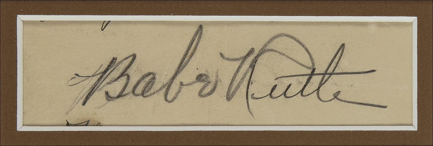 Large vintage pencil signature, “Babe Ruth,” on an off-white slip. Double cloth matted and framed to an overall size of 19.5 x 22.5. In fine condition, with light bisecting folds through signature, a bit of scattered light soiling, and a light surface impression of an unsuccessful first attempt. Pre-certified Steve Grad/PSA/DNA and RRAuction COA.