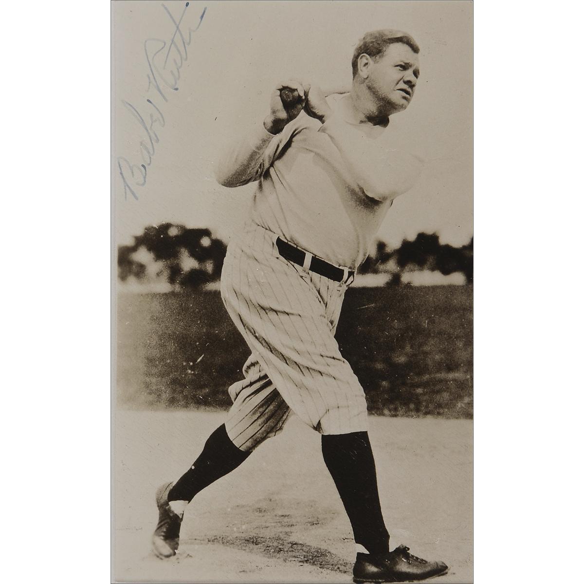 Vintage glossy 3 x 5 photo of Ruth taking a monster practice swing, signed in fountain pen. Double matted and framed to an overall size of 10 x 11.75. In very good condition, with light overall crazing to finish, a few scattered creases and surface marks, and Ruth’s signature a shade light, but completely legible.