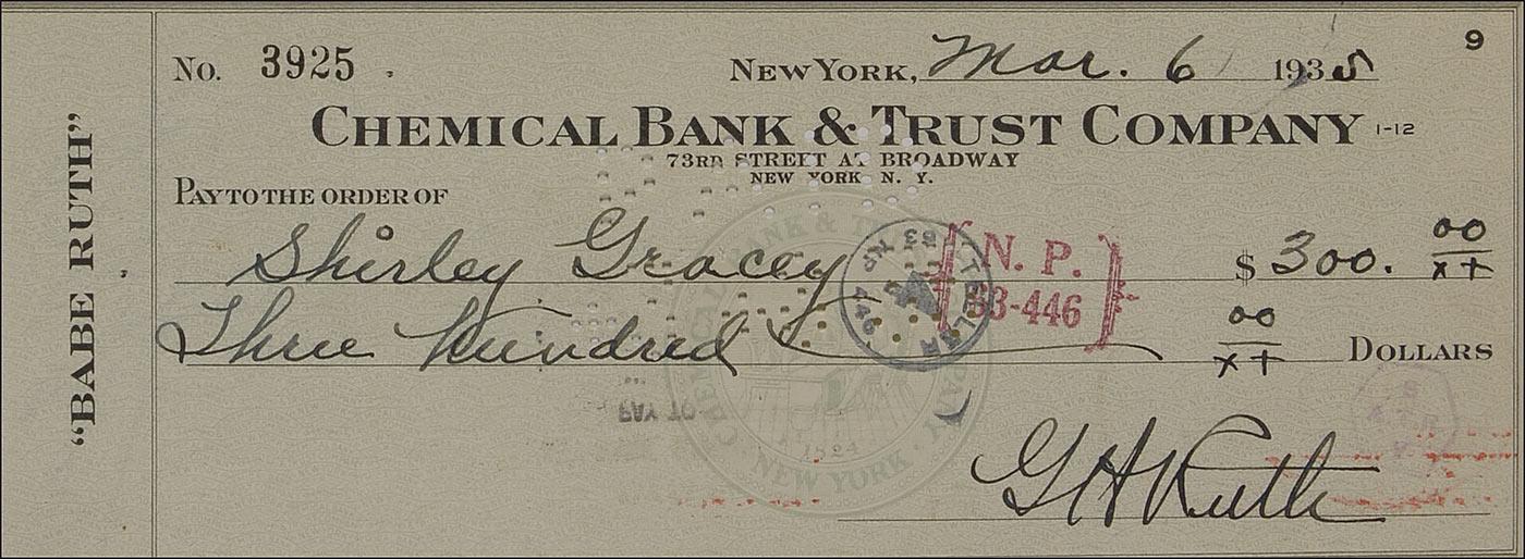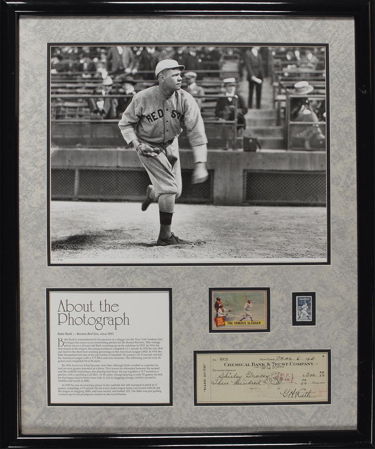 Personal check, 8.25 x 3, filled out and signed by Ruth, “G. H. Ruth,” payable to Shirley Gracie for $300.00, March 6, 1935. Double matted and framed with a superb 17.25 x 13.5 photo of a young Ruth in his Red Sox uniform, blind embossed in the narrow blank lower margin “Francis P. Burke Collection TM,” along with a lengthy caption matted beneath the photo, as well as a Babe Ruth Special baseball card (1962 Topps #138), and the 20¢ Babe Ruth postage stamp, to an overall size of 23.5 x 28.5. A small tear to top edge, expected cancellation holes and stamps away from signature, and light show-through from a stamp trivially affecting the end of the signature, otherwise fine condition. On February 26, 1935, Ruth was released by the Yankees so he could return to Boston and sign with the Boston Braves. Shirley Gracey of St. Petersburg was a Vice President of the Florida Junior Chamber of Commerce. Ruth had arrived at St. Petersburg for his first Spring Training as a Member of the Boston Braves on the evening of March 4, 1935, and began working out at Water Front Park the next day. Eight days later, preparing to begin what turned out to be his last three months as a major league baseball player, Babe Ruth signed this check. Oversized.