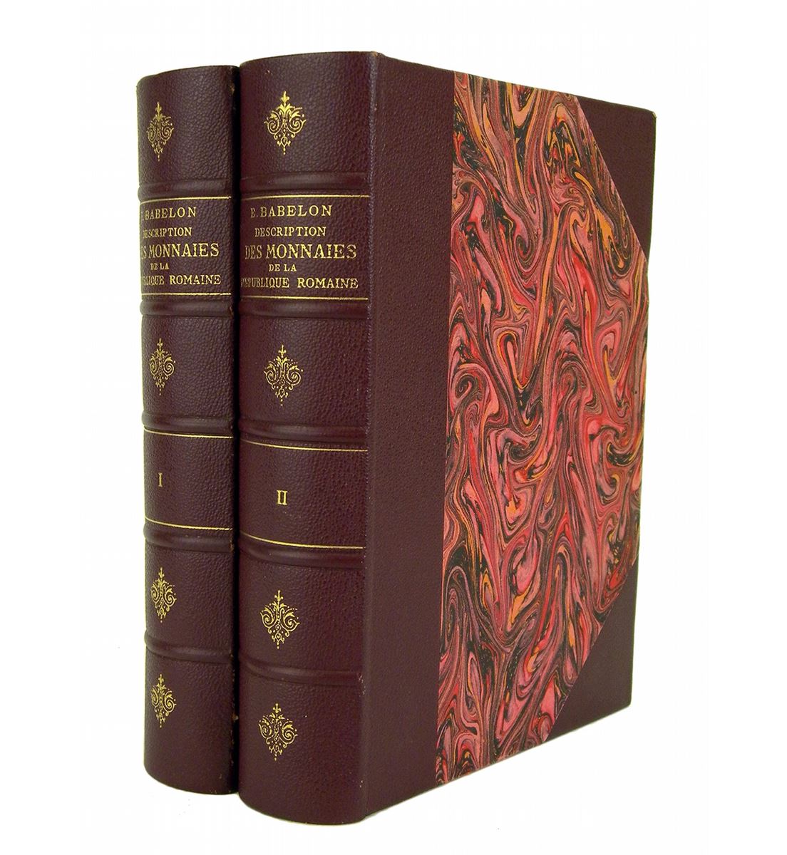 Babelon, Ernest. DESCRIPTION HISTORIQUE ET CHRONOLOGIQUE DES MONNAIES DE LA RÉPUBLIQUE ROMAINE, VULGAIREMENT APPELÉES MONNAIES CONSULAIRES. Reprint. Bologna: Forni, 1963. Two volumes. 8vo, original matching maroon half morocco, gilt; marbled sides and endpapers. xviii, lvi, 562, (2); (4), 669, (1) pages; coin illustrations throughout the text. Fine. An attractive reprint. Clain-Stefanelli 3714*.