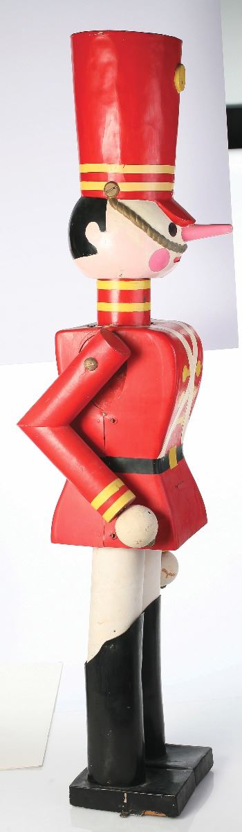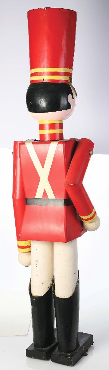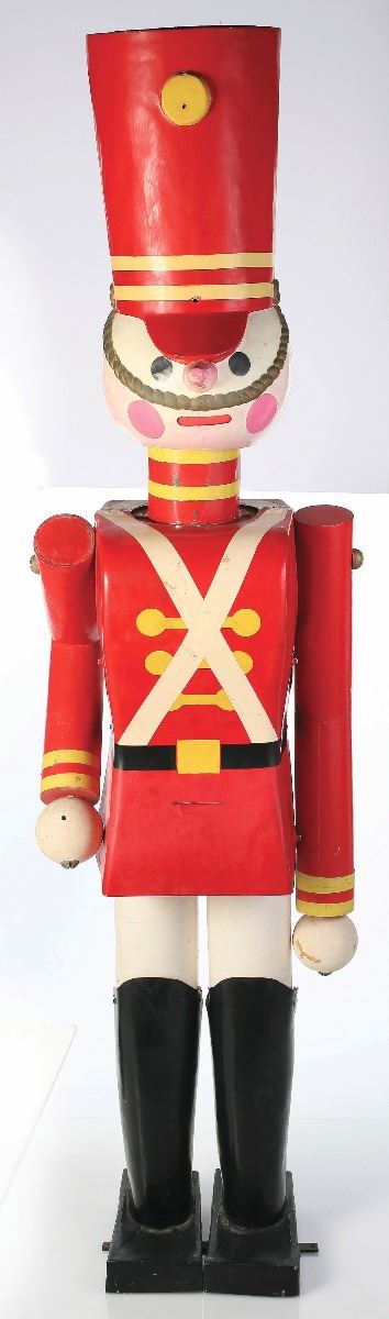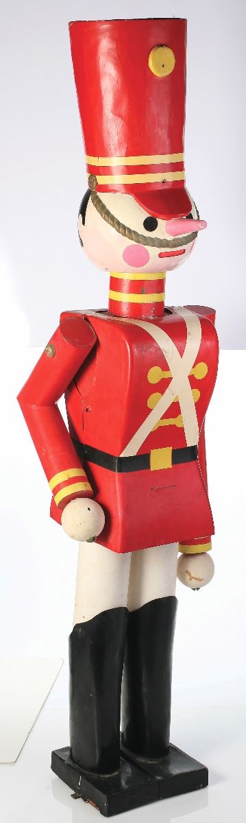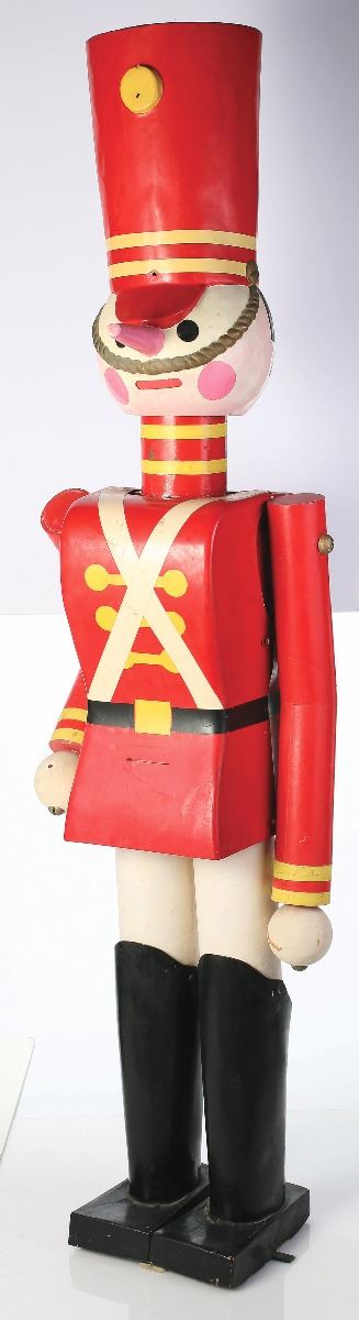 (Walt Disney Studios, 1961) Amazing "Babes In Toyland" prop Toy Soldier. Although most of the soldiers in the feature are miniatures, a few full size props had to be built. This particular soldier, constructed of wood, and metal is featured prominately in publicity photos for the film. Measuring 18"x25"x90" high, the prop is in good condition with wear throughout. A very unique piece of memorabilia from the movie.