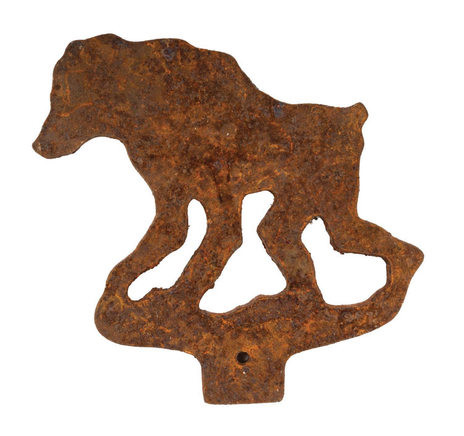 (Disneyland, c.1962-82) An original metal target from the Big Game Safari Shooting Gallery in Adventureland. The baboon-shaped target measures 7.5" tall and 7.75" at its widest point. It is in good condition, with wear and oxidation.