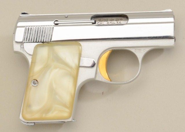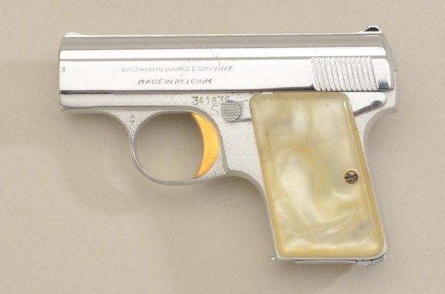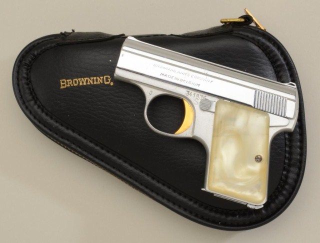 Baby Browning semi-auto pistol, .25 cal., factory nickel with gold trigger and simulated pearl grips, #341836 with Browning soft boot; very good to near fine condition, 95-97% finish; slight use and nicks. Est.:$300-$600.