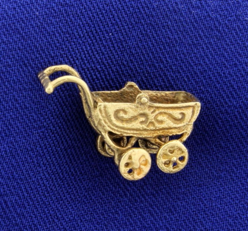 In 14K yellow gold it is 7/8 inch long and the wheels turn. 3.1g