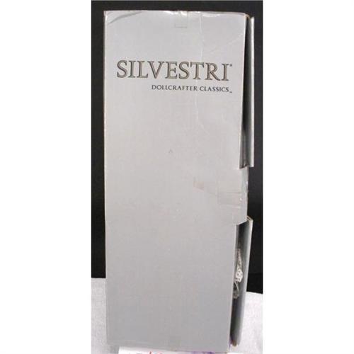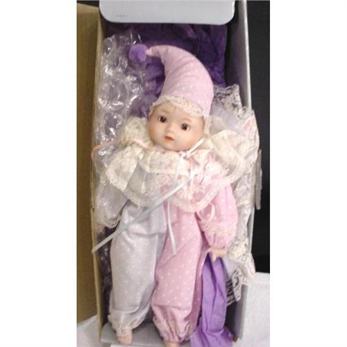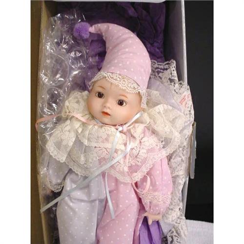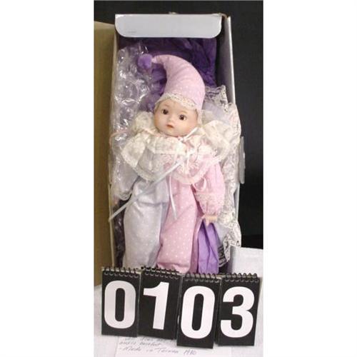 Baby clown doll made by Silvestri Dollcrafter Classics in 1980. Hand painted porcelain with light blue and purple clothing and has light blue pillow, marked "SANKYO". Good condition. Doll measures 13" x 6" x 2.5" and weighs 9 ounces. [