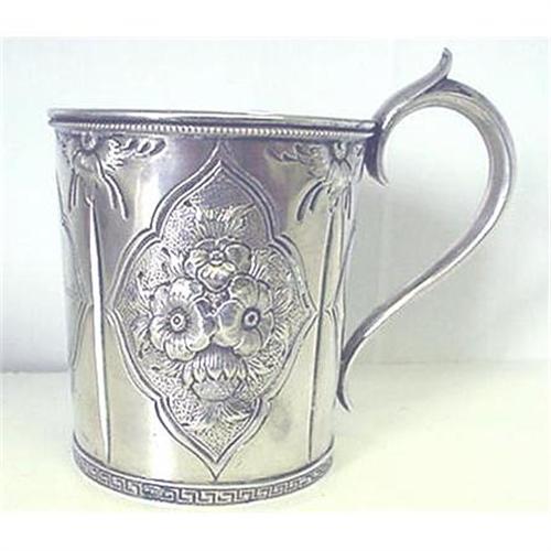 A wonderful baby cup made before the Civil War--The double "C" scroll handle holds the repousse floral body of the cup.( the same design on both sides)It has a beaded rim and greek key die roll applied on the base -The bottom is not gold washed - just lighting - in an effort to get a pic of this early Gorham mark -- with the Lion facing left - instead of right as in the later years. --The engraving is a later date -- perhaps given as a gift to a grandchild at the turn of the century - In any case -- we welcome your questions about this piece as well as our collection of baby silver -- flatware and holloware .
