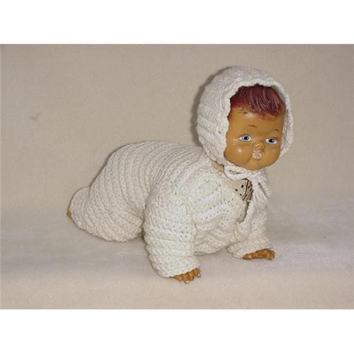 A mid 20th century mechanical baby doll, 13" long, 10 1/2" tall, metal body with hard rubber face, hands and feet. "Call Me Baby" by Rosko, Japan. The doll will crawl and make a baby "sound" at the sound of your voice. In other words, it's voice (or sound) activated. After you call it, the doll will crawl a while and make a sound, then it will stop. To make it move again you have to "call" it again. The original clothing was a simple yellow cotton jumper, this doll is dressed in a crochet jumpsuit with hat. The battery compartment look as though it takes a nine volt and two D batteries. It may or may not work, we haven't tried it. Sold as is.(3)