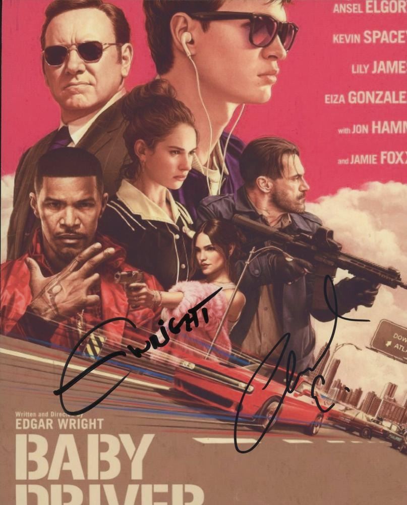 Baby Driver signed movie photo autographed by Ansel Elgort and Edgar Wright. 8x10 inches.