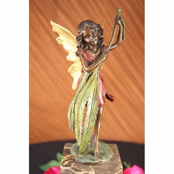 Daydreamers will fall in love with this daydreaming fairy. She wanders around the mystical forest, her eyes taking in all the magic around her. She is lulled by the soft sounds of life and fantasy around her. With youthful innocence she giggles with glee. Her fairy wings arch behind her. She wears a red patina dress. This would make a sweet addition to any little girls room. This sculpture was cast using the lost wax method and mounted on a marble base. Bronze dimensions with marble base: Height 13 X Width 4 inches. Weight: 8 lbs. Please Note: This is a reproduction bronze sculpture from the original molded and signed. This featured bronze sculpture is a recast after the original, and has been done recently. This 100% bronze sculpture is an abstract piece certain to be a conversation piece.Please Note: This is a reproduction bronze sculpture from the original molded and signed. This featured bronze sculpture is a recast after the original, and has been done recently. This 100% bronze sculpture is an abstract piece certain to be a conversation piece.