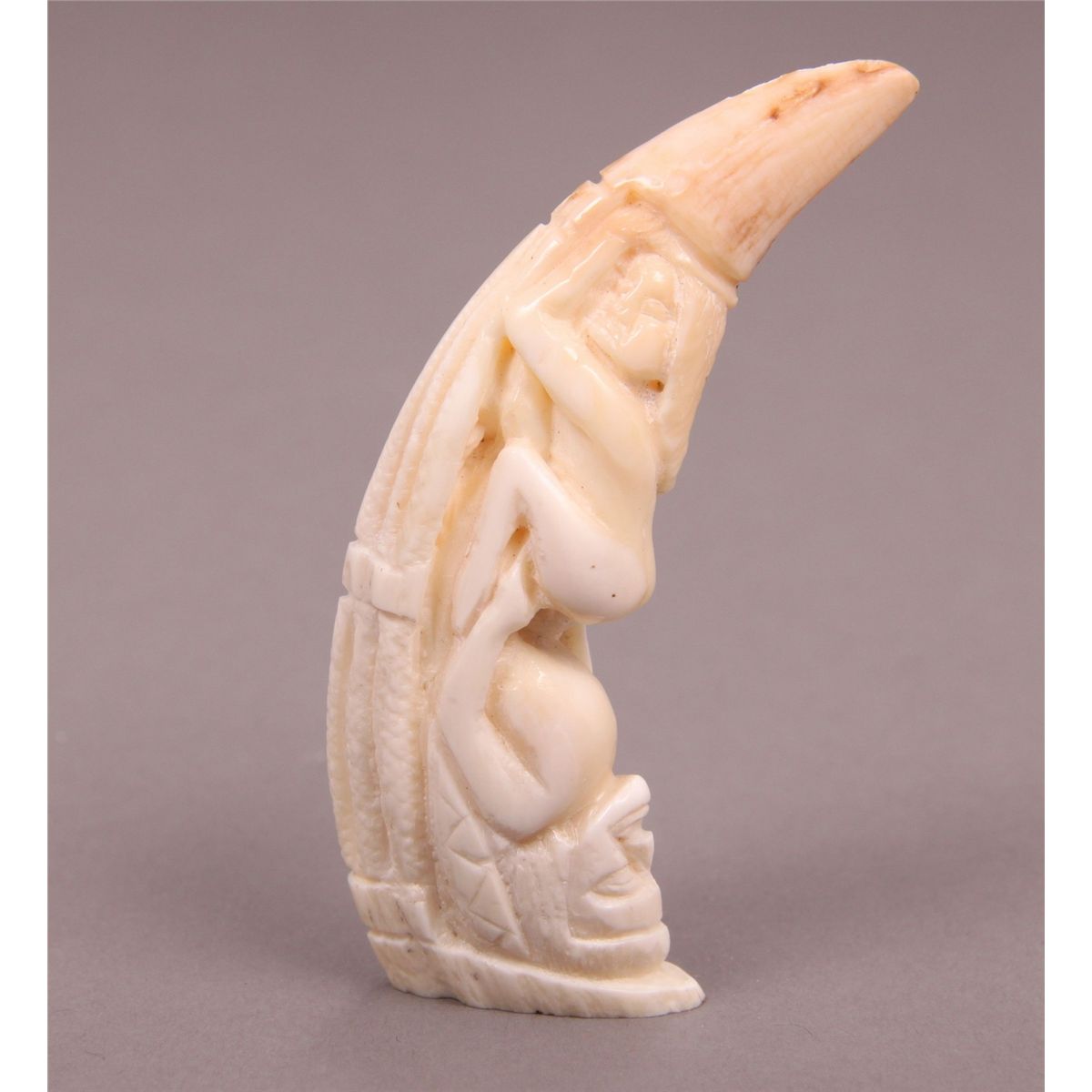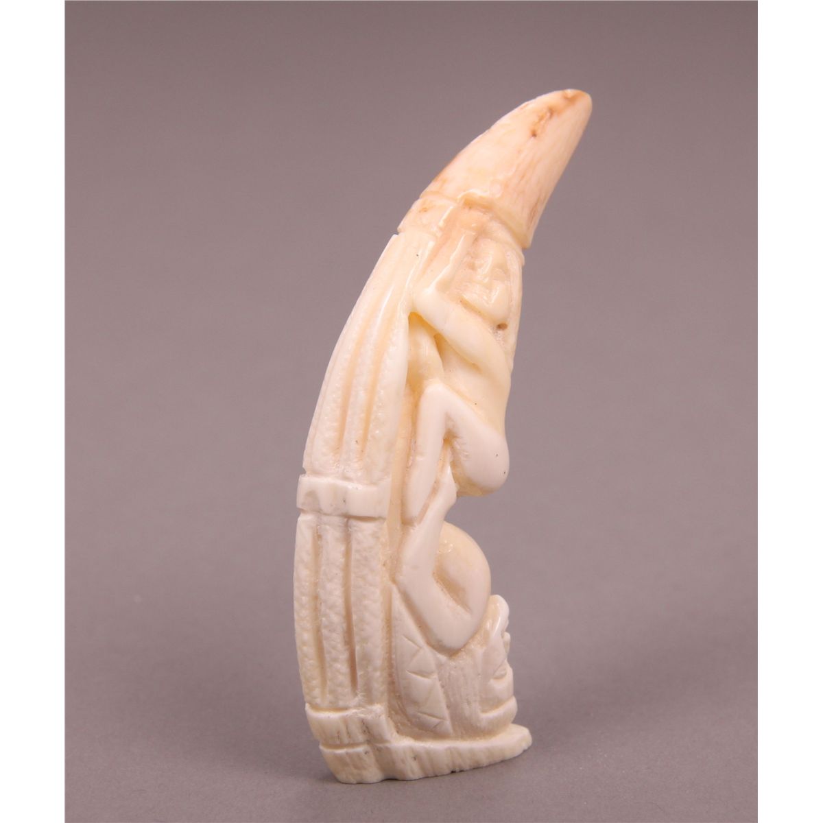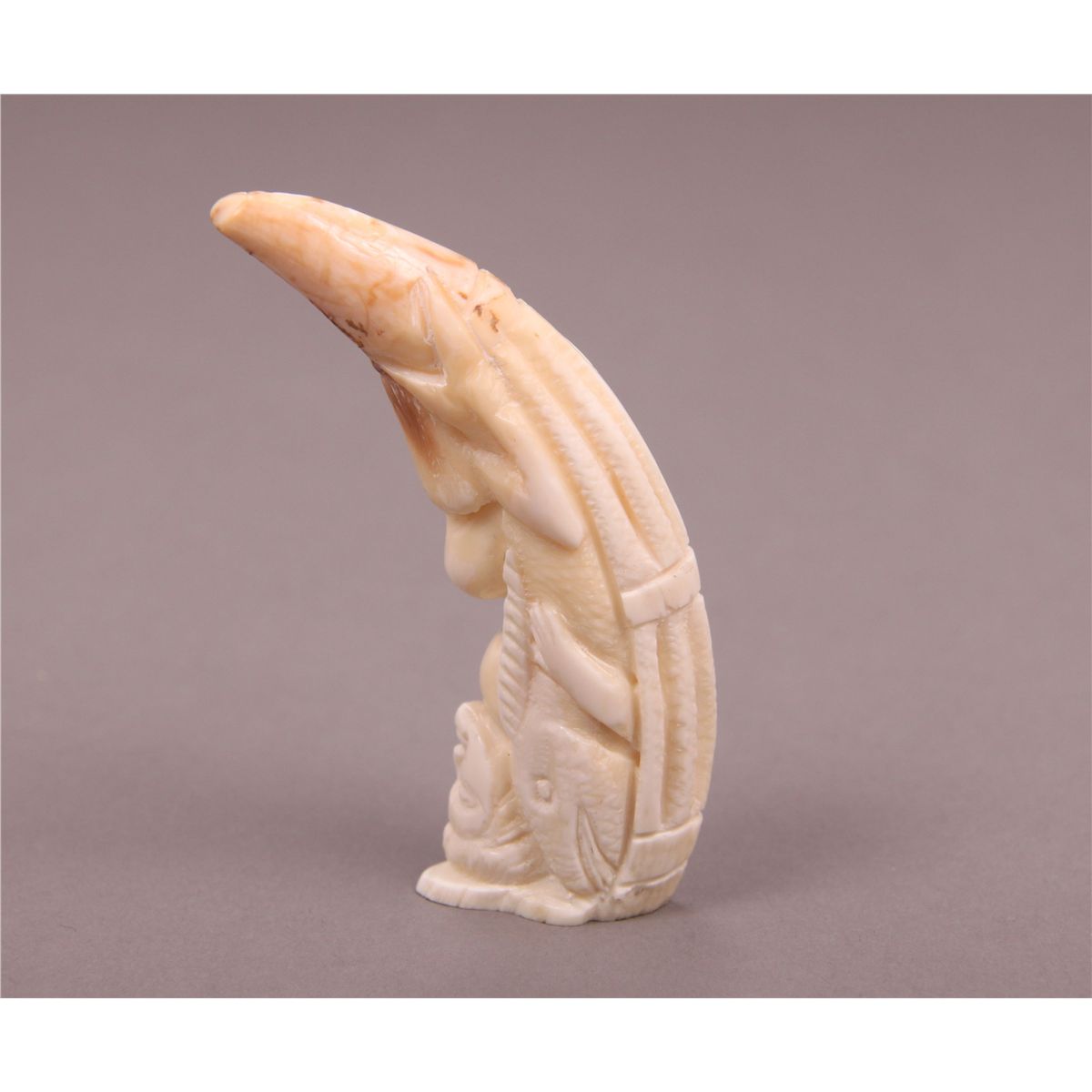 Baby Ivory Tooth carving of a fisherman. 1 side is erotic. [1.10 (oz),3.25 (in),0.75 (in),1.75(in)]