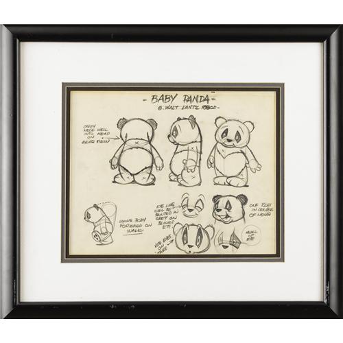 <B>"Baby Panda" Model Sheet Animation Art (Walter Lantz Productions, circa 1939).</B></I> There's nothing cuter than a baby panda! When the odd-looking bears started appearing in U.S. zoos in the late 1930s, Walter Lantz Productions jumped on the bandwagon and introduced Andy Panda in the 1939 short, "Life Begins For Andy Panda." This undated model sheet presents a baby panda as lovable as Andy himself, and has an image area measuring 12" x 9". There is some light paper tanning, light creasing, and edge wear; otherwise the condition is Very Good. Matted and framed. <BR><BR><B>Important notice:</B> Heritage usually auctions material at the rate of 200-250 lots per hour. On some occasions eBay Live bid software or the Internet may not be able to keep up with the pace of the auction. We recommend placing a realistic absentee bid now as insurance to avoid disappointment. Occasionally the auctioneer may eliminate or reject an eBay Live bid, and the auctioneer may also reopen a lot after the close of the eBay live bidding (usually because we missed an audience bid), and may reject your bid even if it shows you as the winning bidder. By bidding via eBay Live, you agree that Heritage may award the lot to another bidder at its sole discretion under the circumstances described above or any other reasonable circumstances. Since eBay bids are not shown to us until we open the lot on the floor, we treat those bids just like floor bids. In most cases the floor responds before the eBay bid is presented to us, due to Internet lag time, so for consistency we have made it a policy that floor bids are always considered first over tie eBay live bids. Also please note that all Heritage lots purchased through eBay Live carry a 22.5% Buyer's Premium. Please make sure you read the Terms and Conditions before you bid. This lot is being auctioned in conjunction with a live floor auction by Heritage Auction Galleries. All final auction and invoice information will be supplied by Heritage Auction Galleries, and all other information should be considered preliminary. Lot:41001 <BR><BR><B>Winning Notification and Billing:</B> After the FINAL session in this auction is complete, Heritage will send e-mail and snail mail invoices. This process normally takes several days. All final auction and invoice information will be supplied by Heritage Auction Galleries, and all other information should be considered preliminary. <BR><BR>This auction will be conducted on a live auction floor and over the Internet through eBay Live. If you choose to place an absentee bid, please take a moment to <font color='#0000ff'><u><a href='http://pages.ebay.com/liveauctions/help/before/laabsentee.html'>learn how eBay Live absentee bidding works</a></u></font><font color='#000000'>