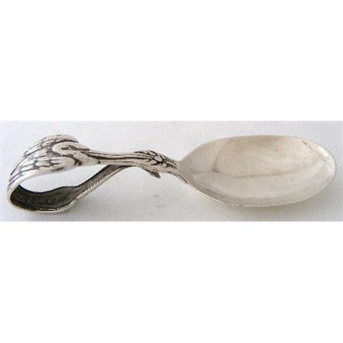 A sterling silver baby spoon from c1950. Made by the Sterling Silver Manufacturing Company and marked "SSMC Sterling" The handle is a stork with his beak pointing down towards the bowl and the feet curled round to the back. Very slight evidence of wear.