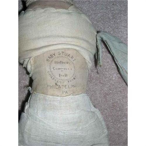 </font></strong>This is a cotton stuffed doll that originally had printed features made by Mothers' Congress Doll Co., Philadelphia, PA under patent granted to Madge L. Mead in 1900. This doll has been well loved and someone has put new arms on her. The great thing is that the stamped marking is very clear. The date only shows Pat Nov. but that's fine. Her features are almost nonexistent. She has the printed black shoes and there are wears and the cotton is exposed in places. I've just left the old piece of lace around the neck but the head is originally attached, no extra stitching so the lace is not hiding anything. On the very top of the head is a hold and you can see the cotton. I have included a picture. This doll is really for the person who wants the have an example of a 1900 doll with the Mothers' Congress marking. There is a picture of another Baby Stuart in The Art of Dolls 1700-1940 by Madeline Osborne Merrill on page 416. She doesn't have any bad smells and she's from a smoke free environment. If you can love her, please bid. Buyer to pay $15 for shipping, insurance, and handling.Thanks for viewing.</font>