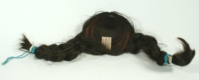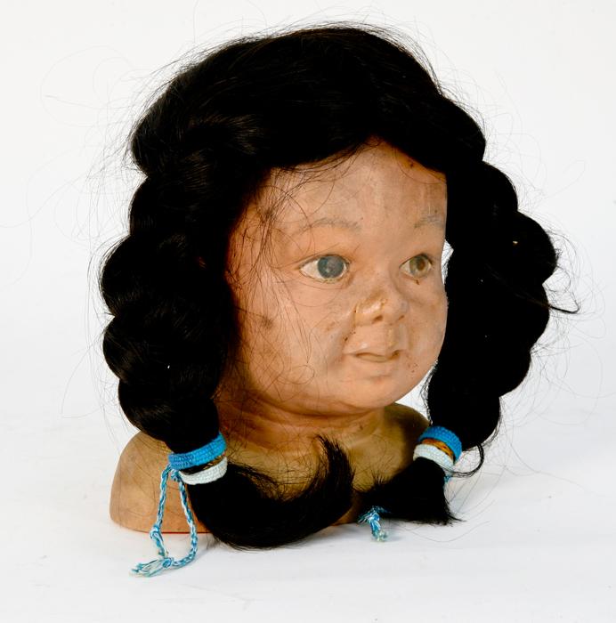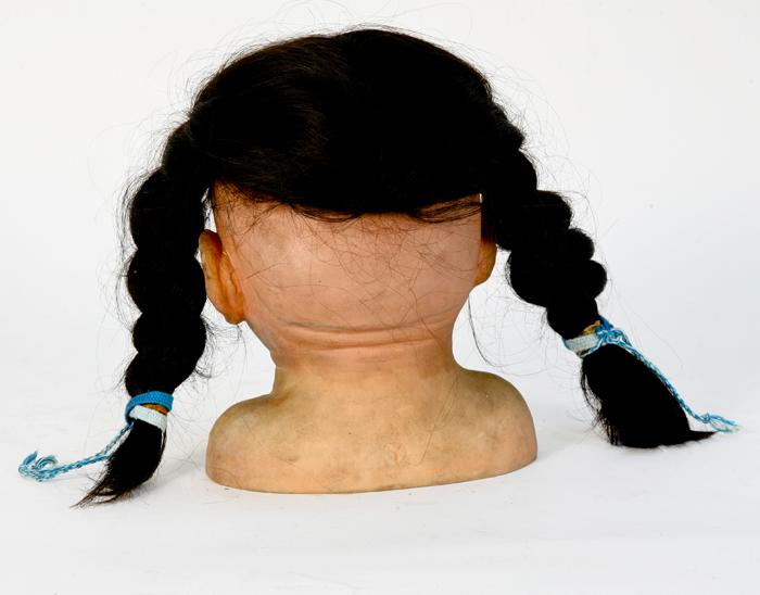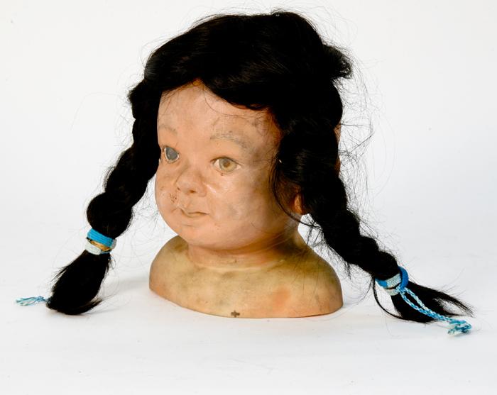 From the Max Factor Collection / Rubber Baby Wig Head Block with Black Braided Wig / Wig Designed By Max Factor, 100% Modacrylic Elura Fiber Mfd, Wig made in Korea