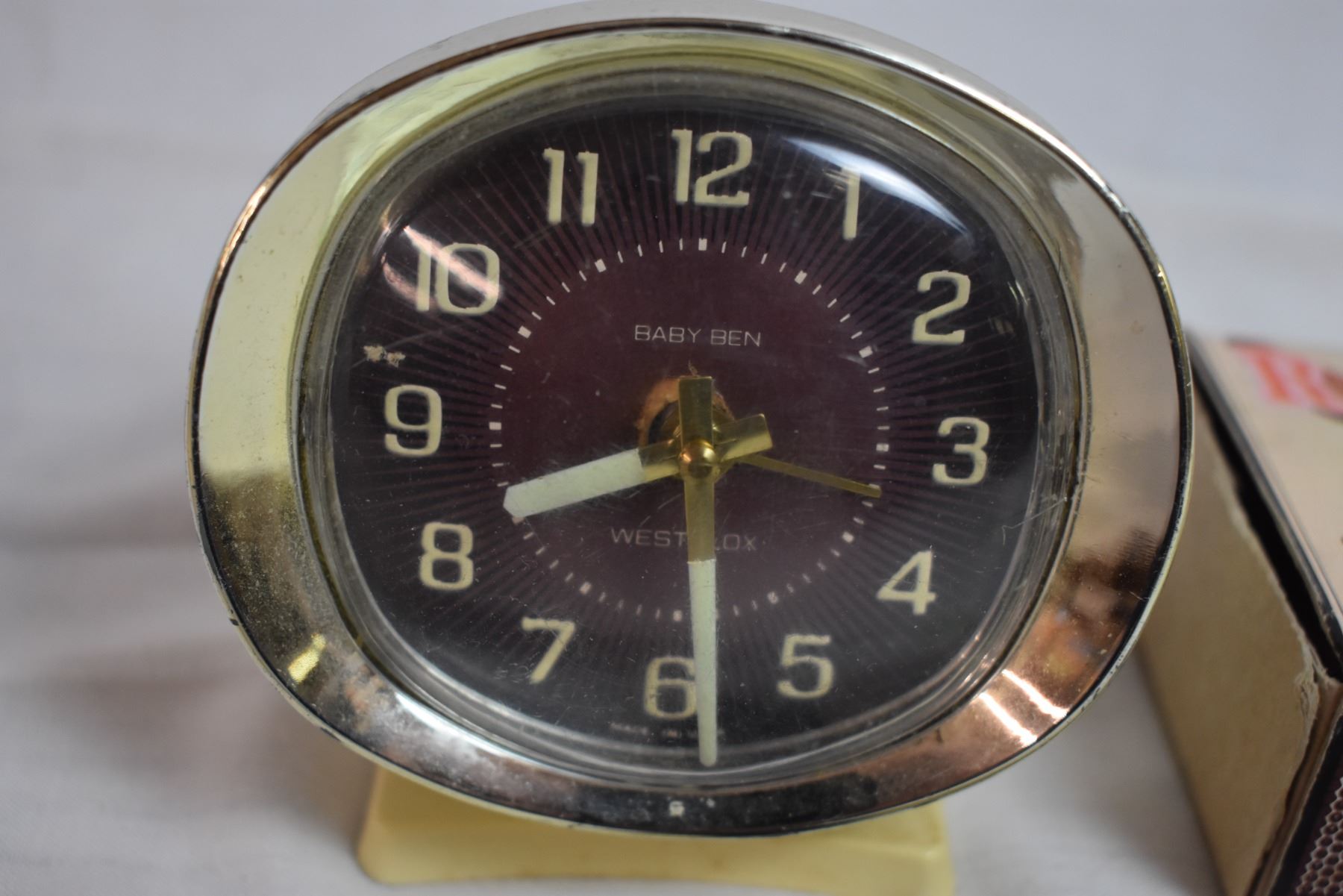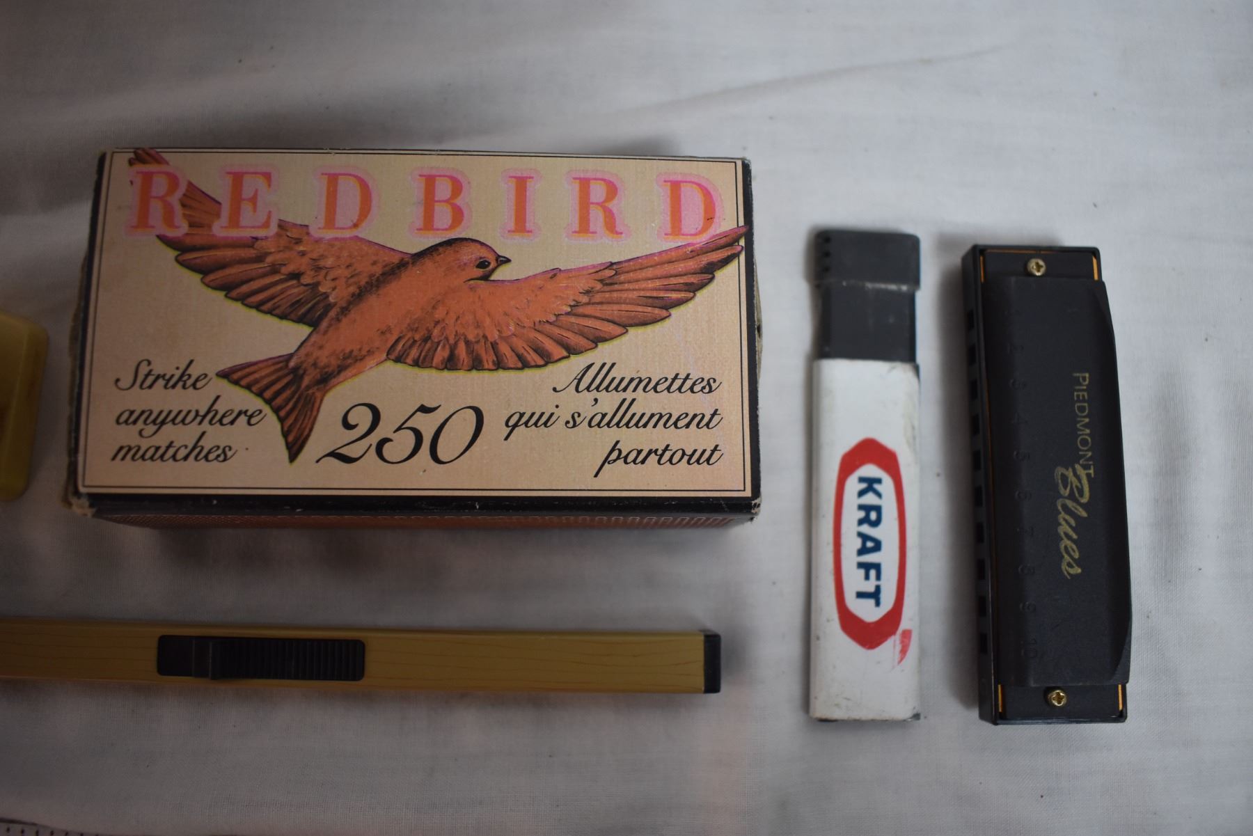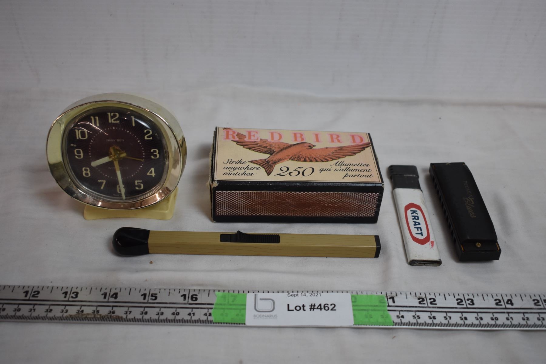 Baby ben clock, matchbox, hohner harmonica, bbq lighter