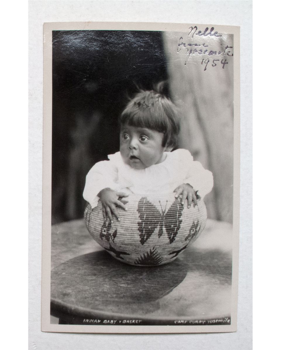 A wide-eyed Indian toddler sits in a beautiful “butterfly” basket in this RPC. The used post card carries a date of 1954. Sold at Yosemite National Park, Camp Curry.City: County: State: CA
