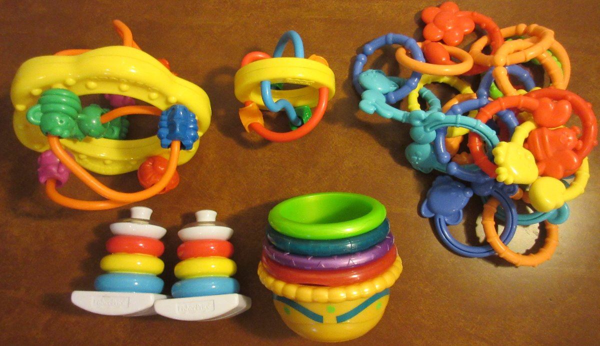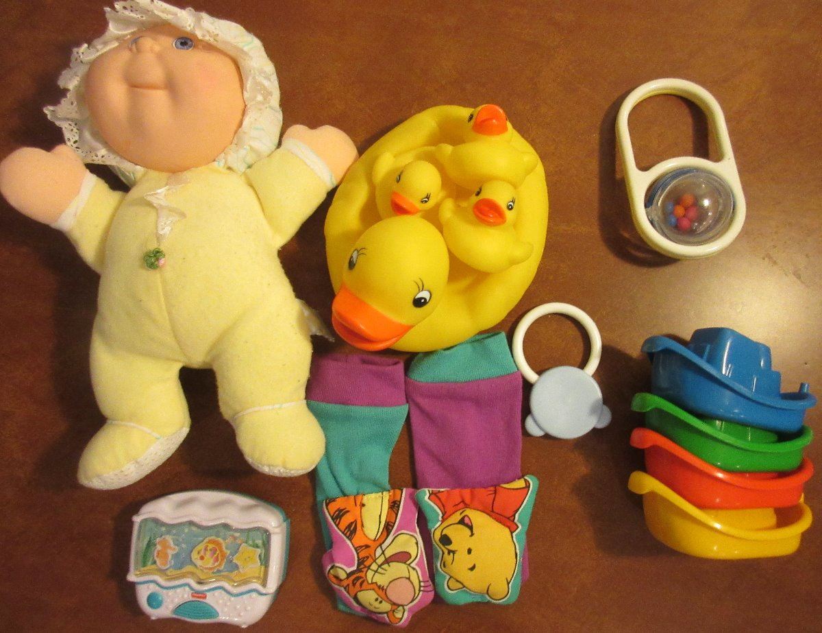 Safety 1st, Safe Glow 2 I monitor in original box. Flexible range 400' Receiver plug in or 9V Battery, Royal Doulton Bunnykins - Plate, Bowl and Cup in original box, 2 Sets Baby Lamb New Zealand (my first Kiwi brand never worn onesie, hat, bag, rattle and cuddly lamb) 3 lamas noise makers, 2 fisher price stack em rings rattles, connect a rings 20, 2 Shelcore rings, 5 stack em Bowls by First Years, Wim Toy Ducks, 4 Stack a Boot, Disney Rattle Socks