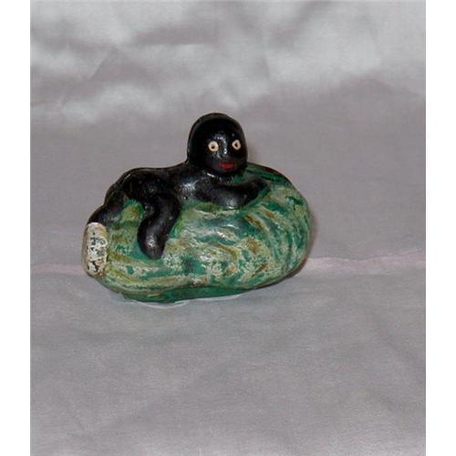 Unique baby bank. Baby is crawling on green rock. Money slit on side. Buyer pays shipping and handling costs.