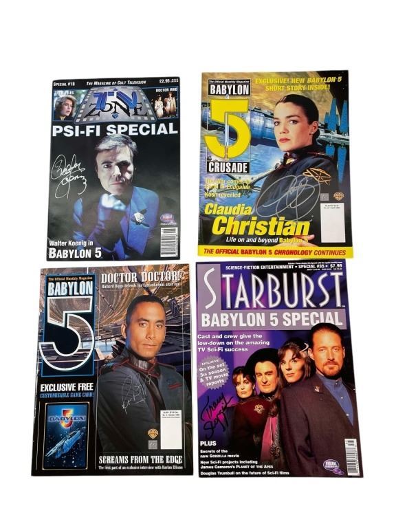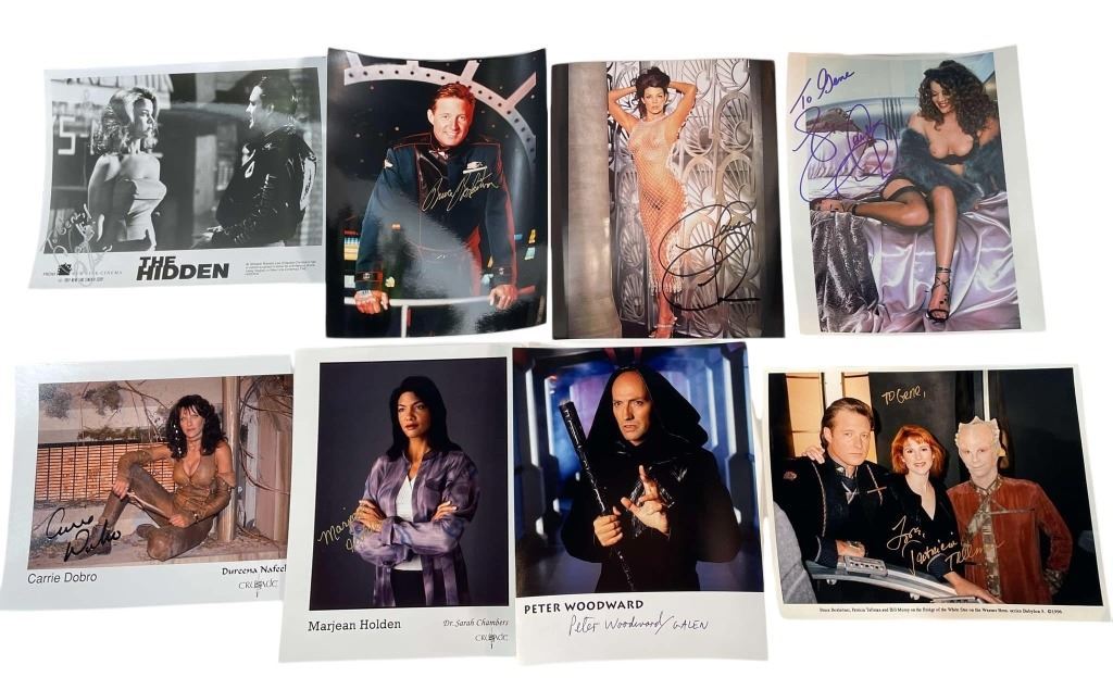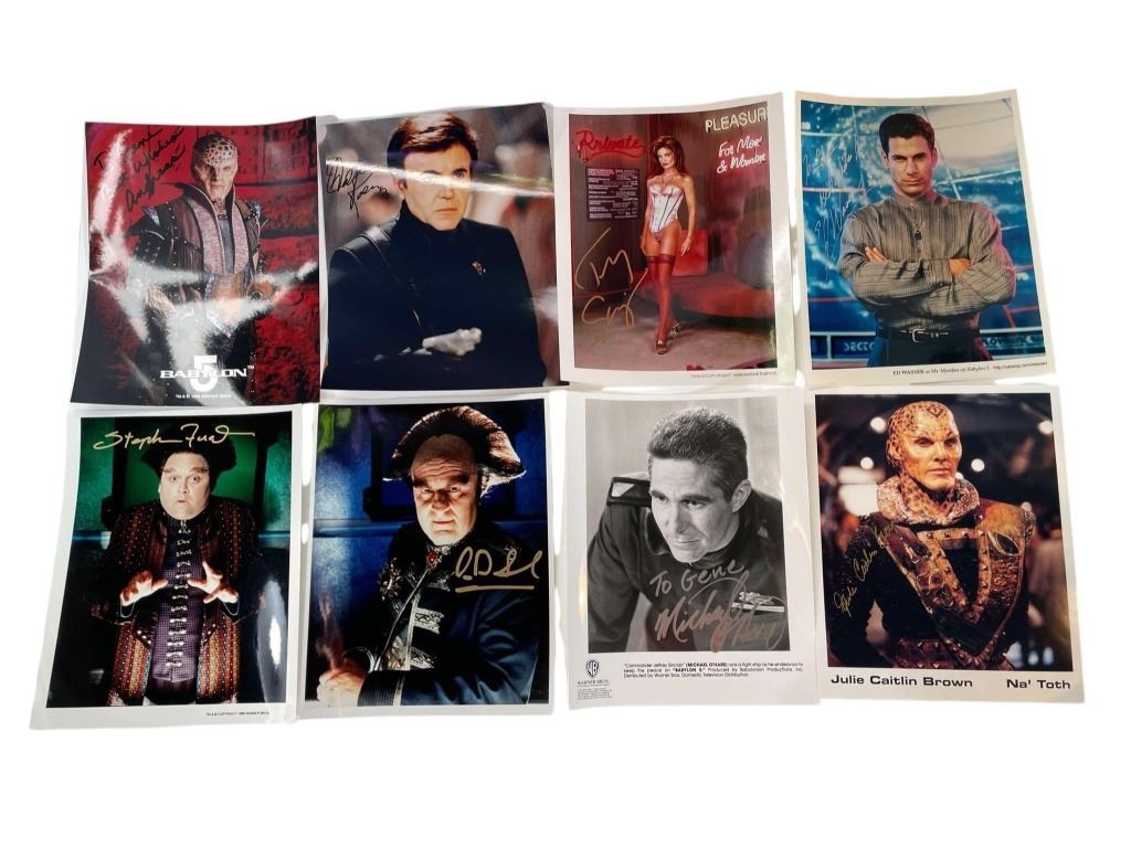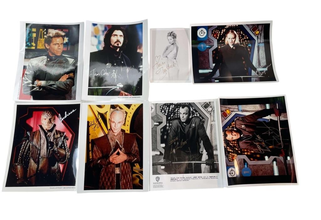 Original collection of 36 autographs from the hit TV show "Babylon 5" (1994–1998), the sci-fi television series created by writer and producer J. Michael Straczynski where, in the mid 23rd Century, the Earth Alliance space station Babylon 5, located in neutral territory, is a major focal point for political intrigue, racial tensions and various wars over the course of five years.