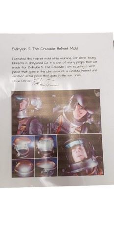 Babylon 5: The Crusade (1999) - Original helmet mold created by David DeFino, who worked for Gene Young Effects in Hollywood, CA. Also included is a vent piece that goes in the chin area of the finished helmet and another piece that goes in the ear area. Comes with a letter of provenance from David DeFino who is an Academy Award winning effects artist and Emmy winning lighting technician. He was the foreman at Gene Young Effects and worked on many amazing, iconic movies and commercials as well as special government projects and private industry and museums.