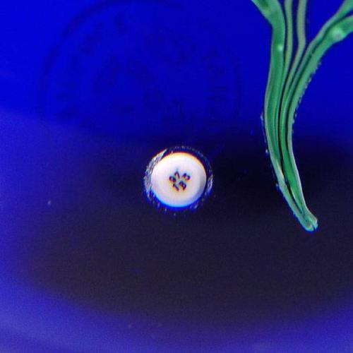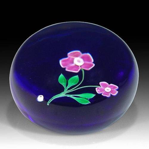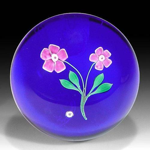 Baccarat 1973 two flower paperweight. Two pink flowers on long green stems with leaves on cobalt blue ground. Signature/date cane. Acid etched with the Baccarat insignia underneath. Diameter 2 15/16". Donated by: John B. Walsh.<p>Proceeds from the auction will go to benefit Santa Cruz, California glass artist Steven Lundberg, who, after 30 years of blowing glass locally, was diagnosed with amyotrophic lateral sclerosis, or ALS (Lou Gehrig's disease). This auction is a fundraising effort to help Steve meet the challenges of this disease.<p>Costs of treating ALS over a period of time can be exorbitant. In the short-term, Steve needs basic equipment such as an electric scooter and pointing devices to help him read and write.<p>Please join us for this auction, and help support a friend. Check out our other auctions to see the 150 paperweights, vessels, and glass sculptures from internationally known glass artists, donated by generous artists, galleries, and glass collectors from all over the country. Please contact us at 1-800-538-0766 or (831) 427-1177 for more information, or see <a href=http://www.selman.com/press target=_blank>www.selman.com/press</a>.