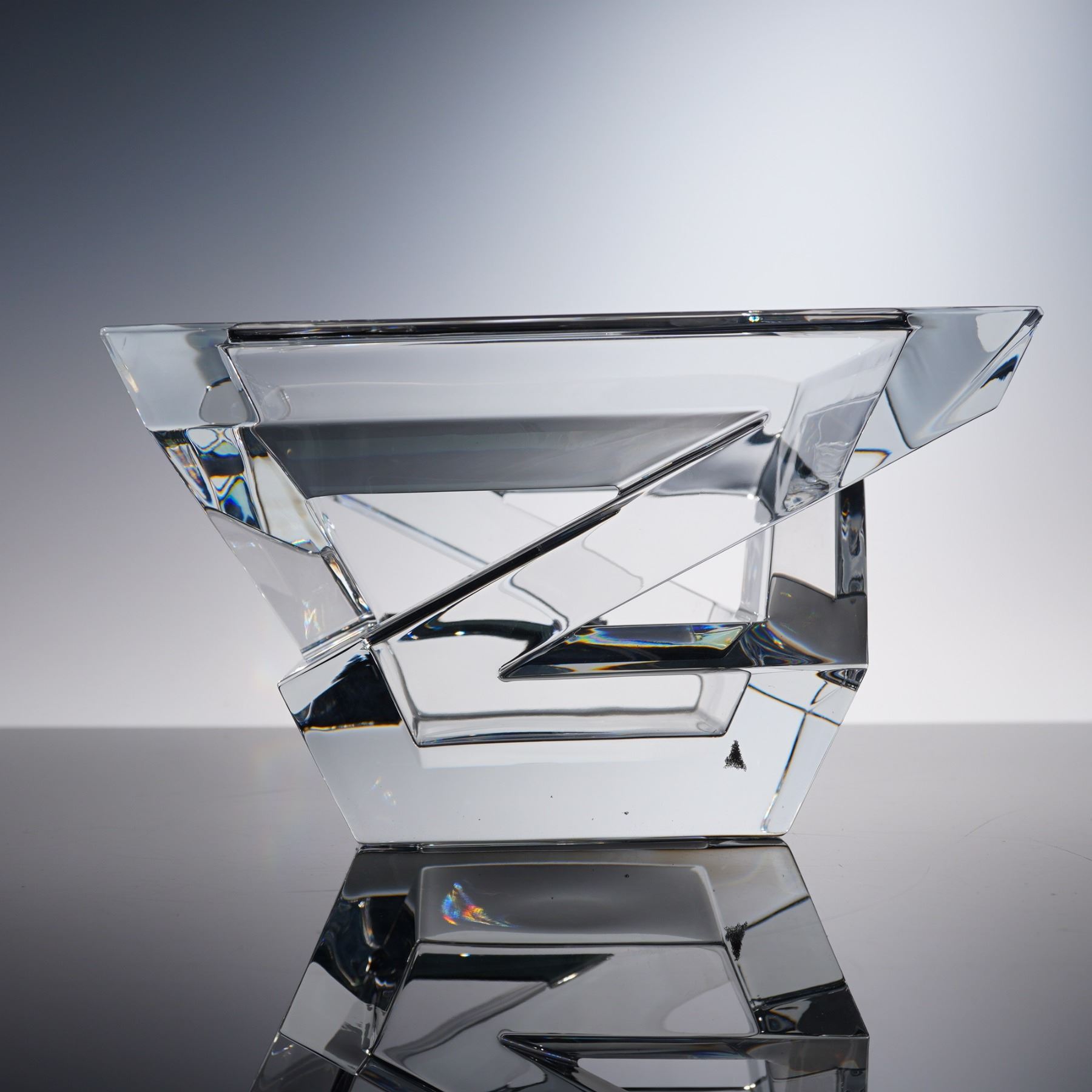 A modern lead crystal vase by Baccarat from the Architecture collection, designed with sharply angled geometric planes and thick beveled walls for a bold architectural silhouette. The design creates prismatic refractions from every angle and exhibits exceptional weight and clarity. Etched signature and acid-stamped hallmark to underside. Includes original red Baccarat box. 8.5"W x 8.5"L x 8.5"H, includes box 12"W x 12"L.