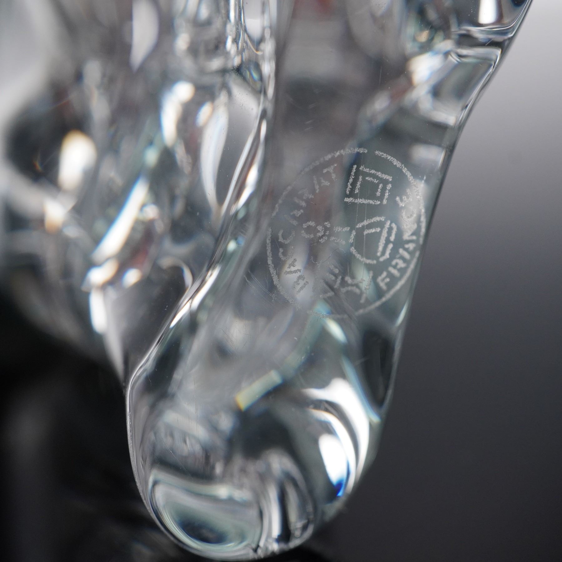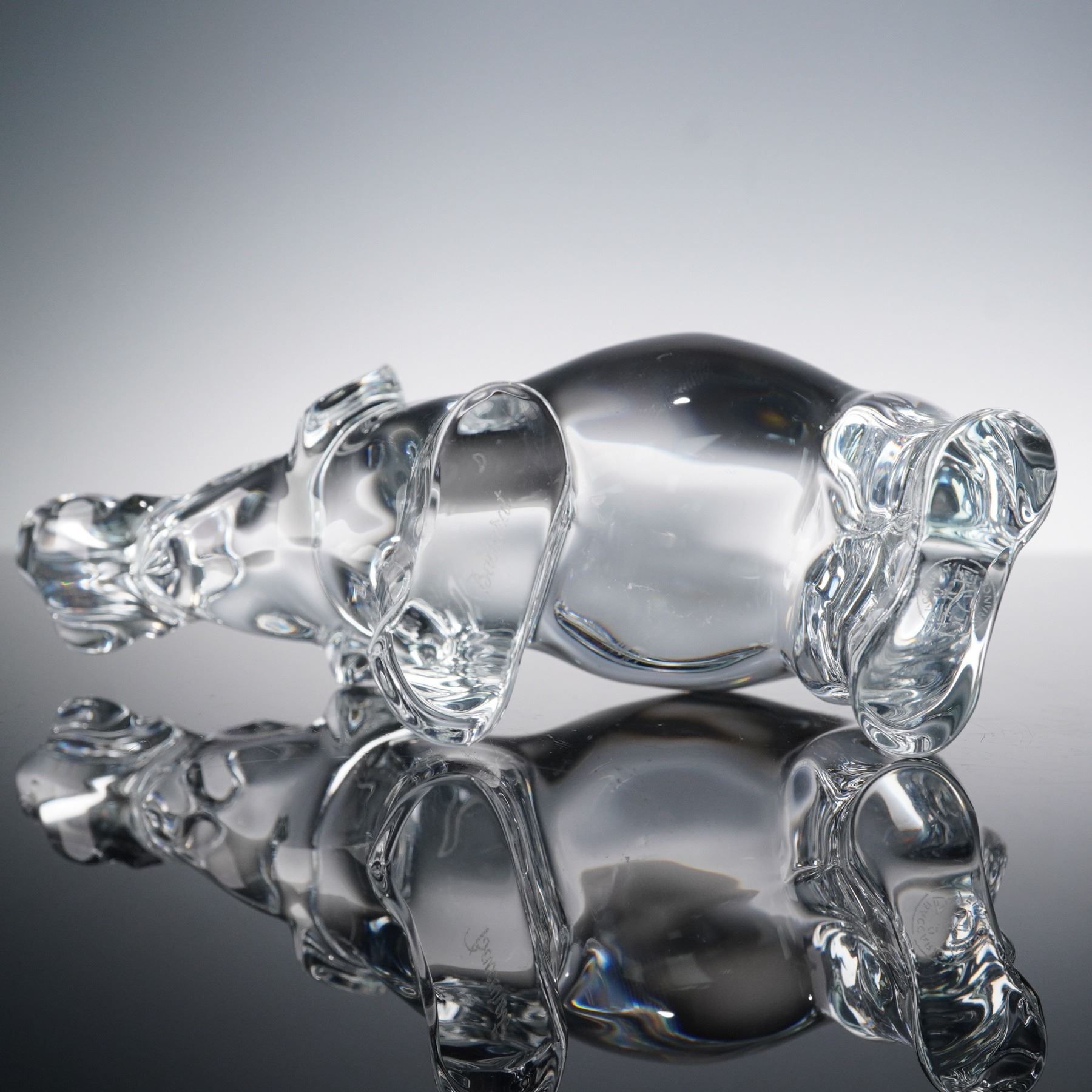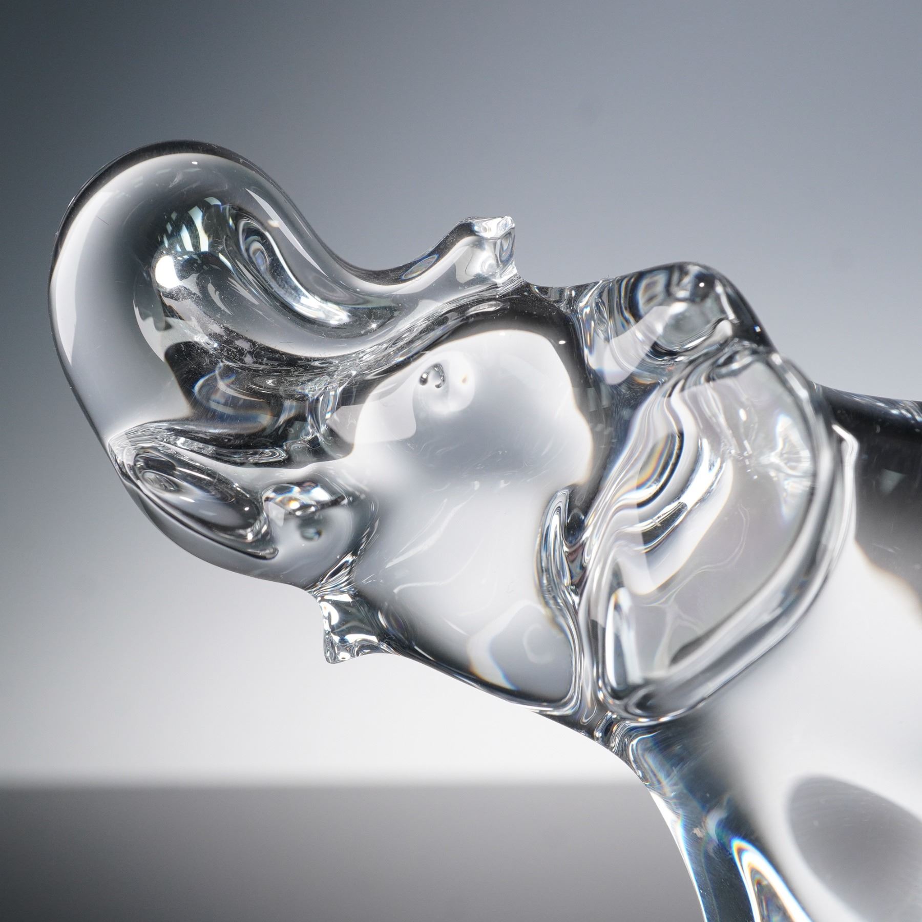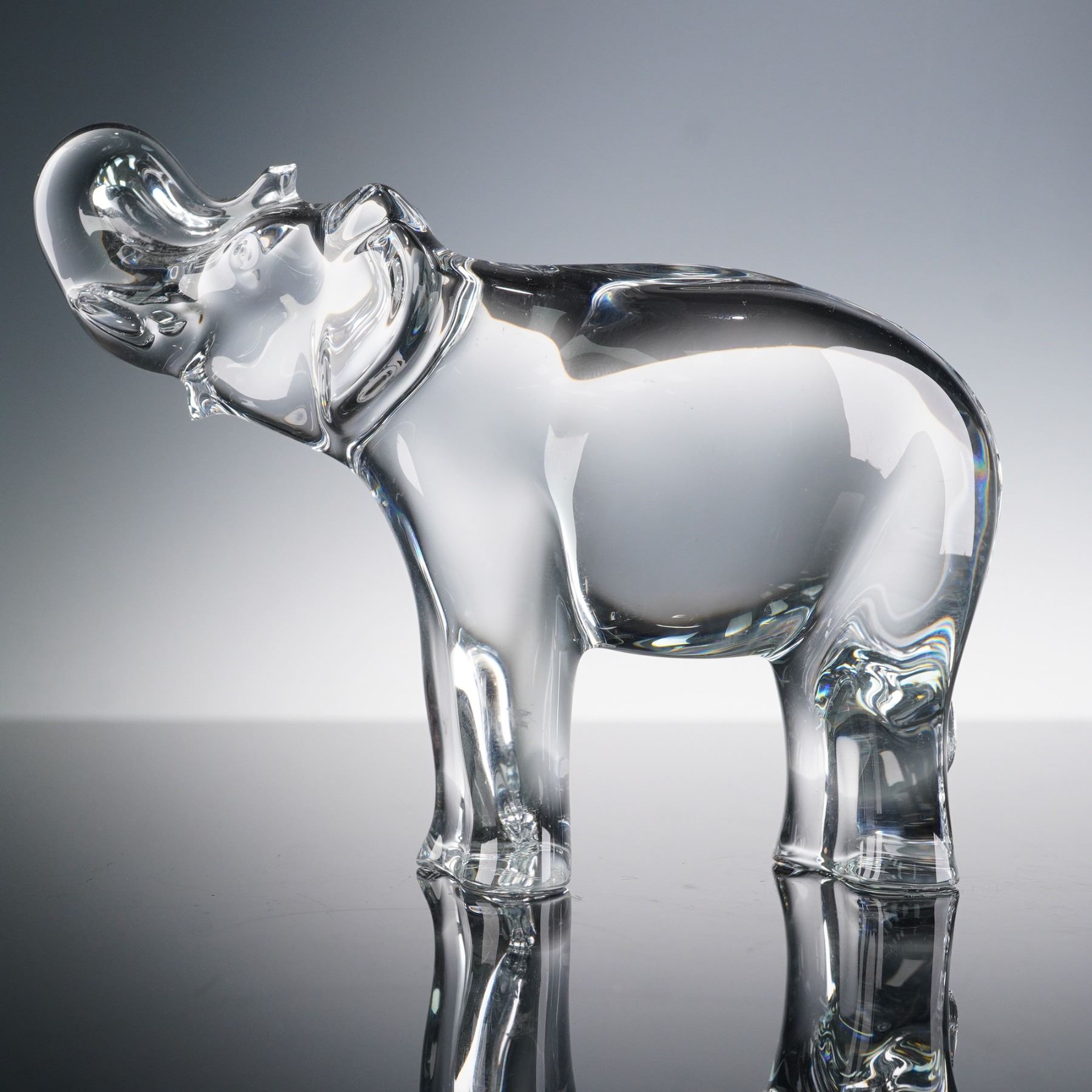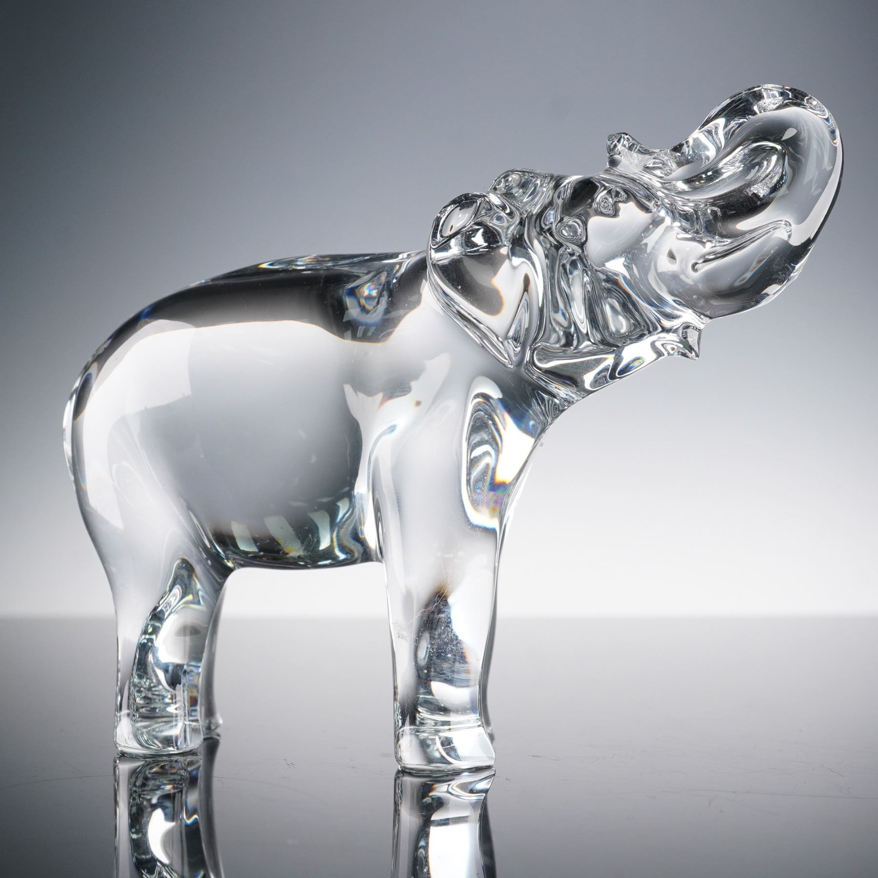 Baccarat clear crystal figurine depicting an elephant with trunk raised in a traditional symbol of good luck. Features finely sculpted details to the ears, trunk, and body. Acid-etched Baccarat France hallmark on the underside. A beautiful and substantial piece showcasing Baccarat's craftsmanship, perfect for collectors of crystal animals or elephant-themed decor.