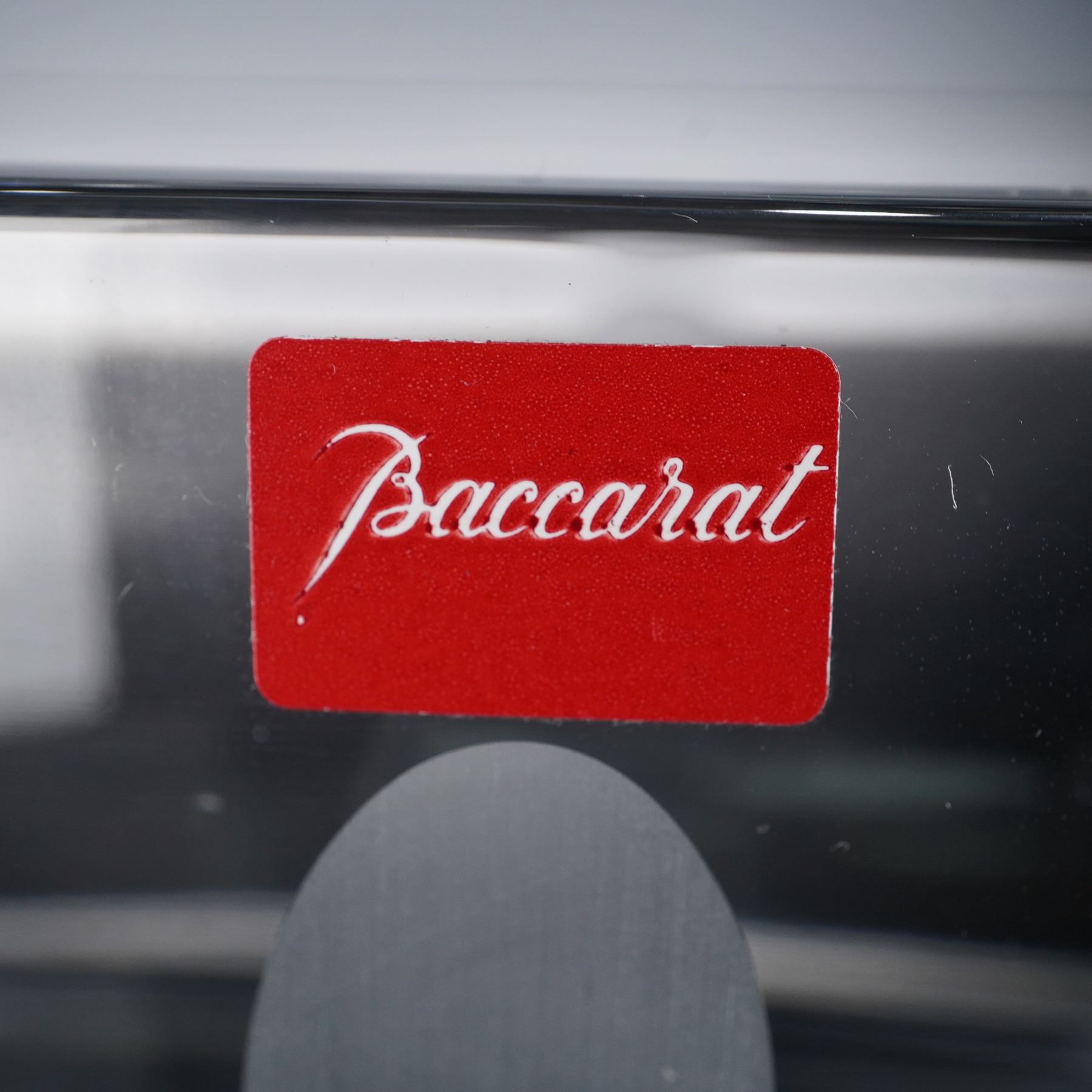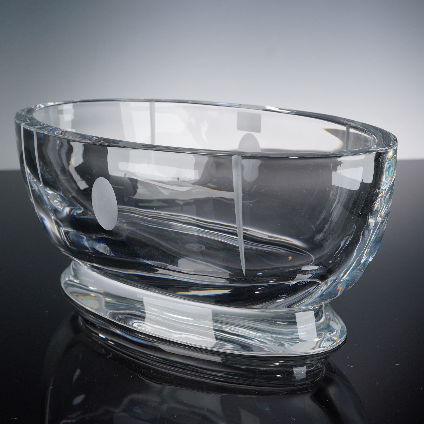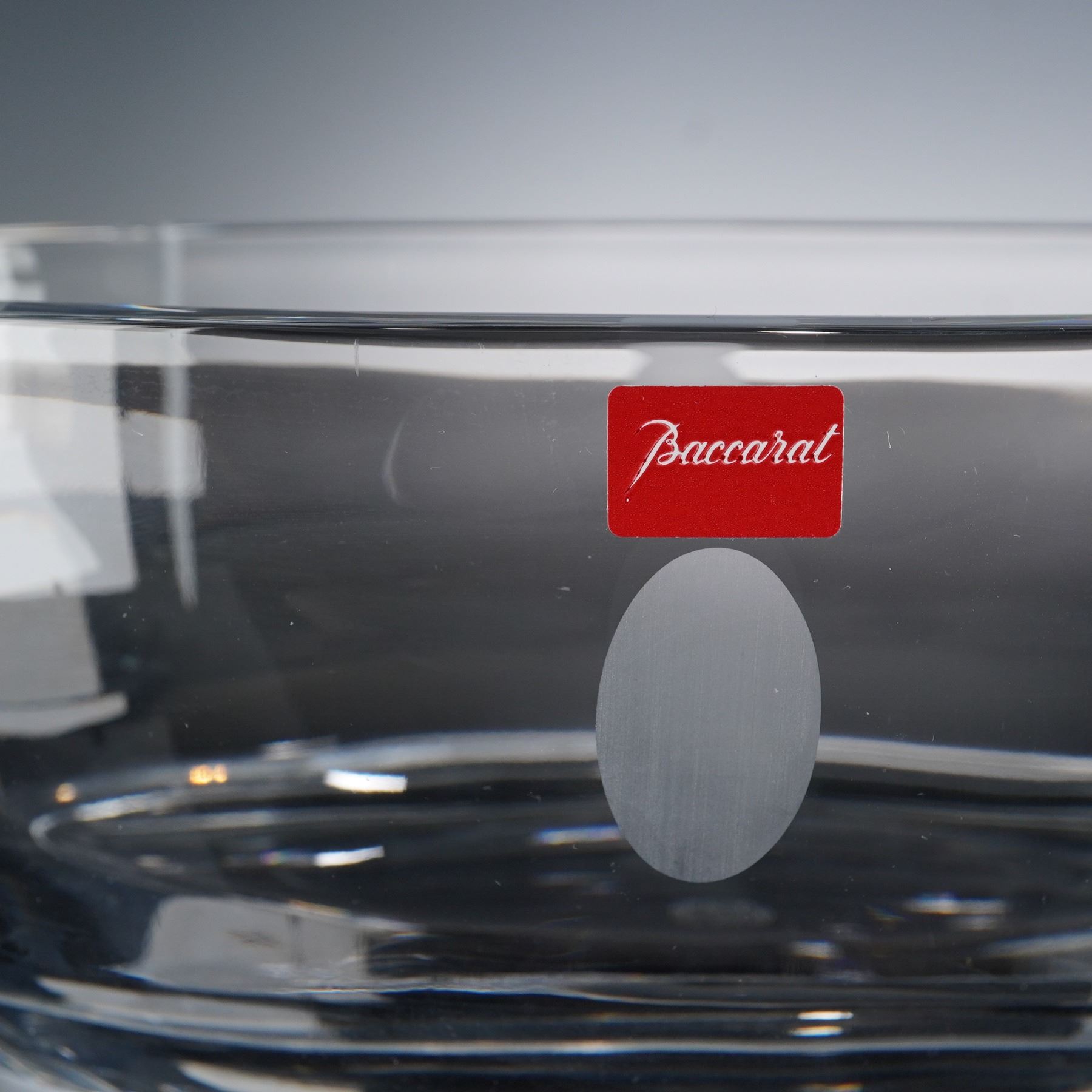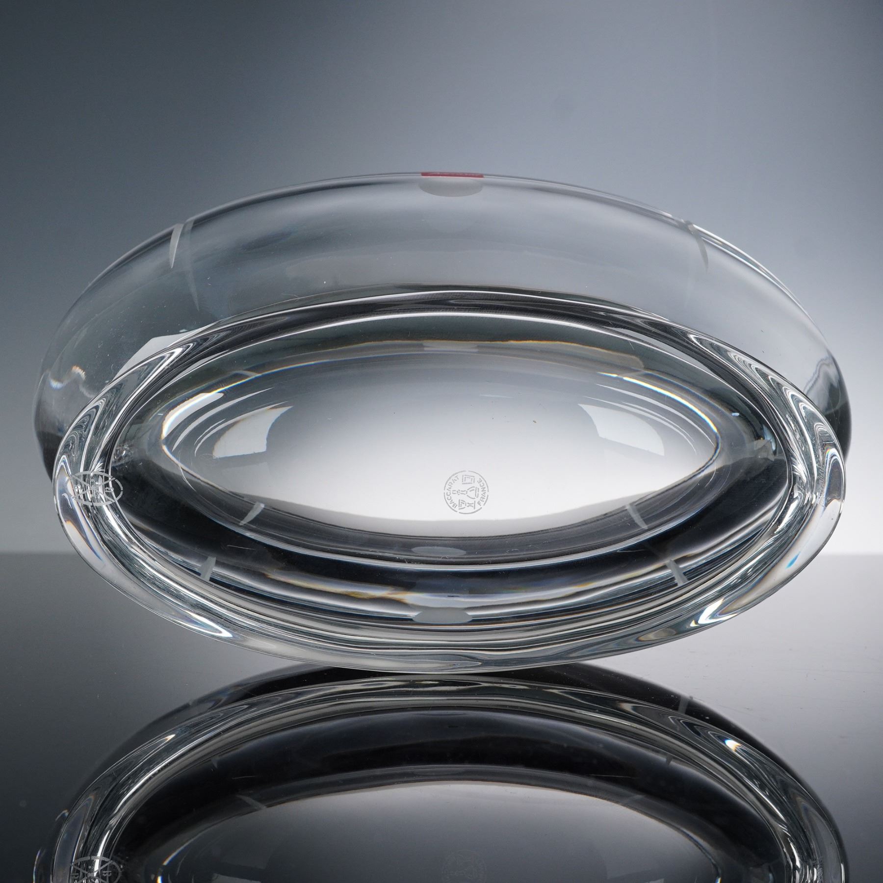 Elegant Baccarat crystal Tranquility bowl featuring a sleek oval form with etched line and dot motif. The bowl is crafted of fine clear crystal, displaying Baccarat's exceptional clarity and craftsmanship. Retains its original red Baccarat label and is etched on the base with the Baccarat France hallmark.