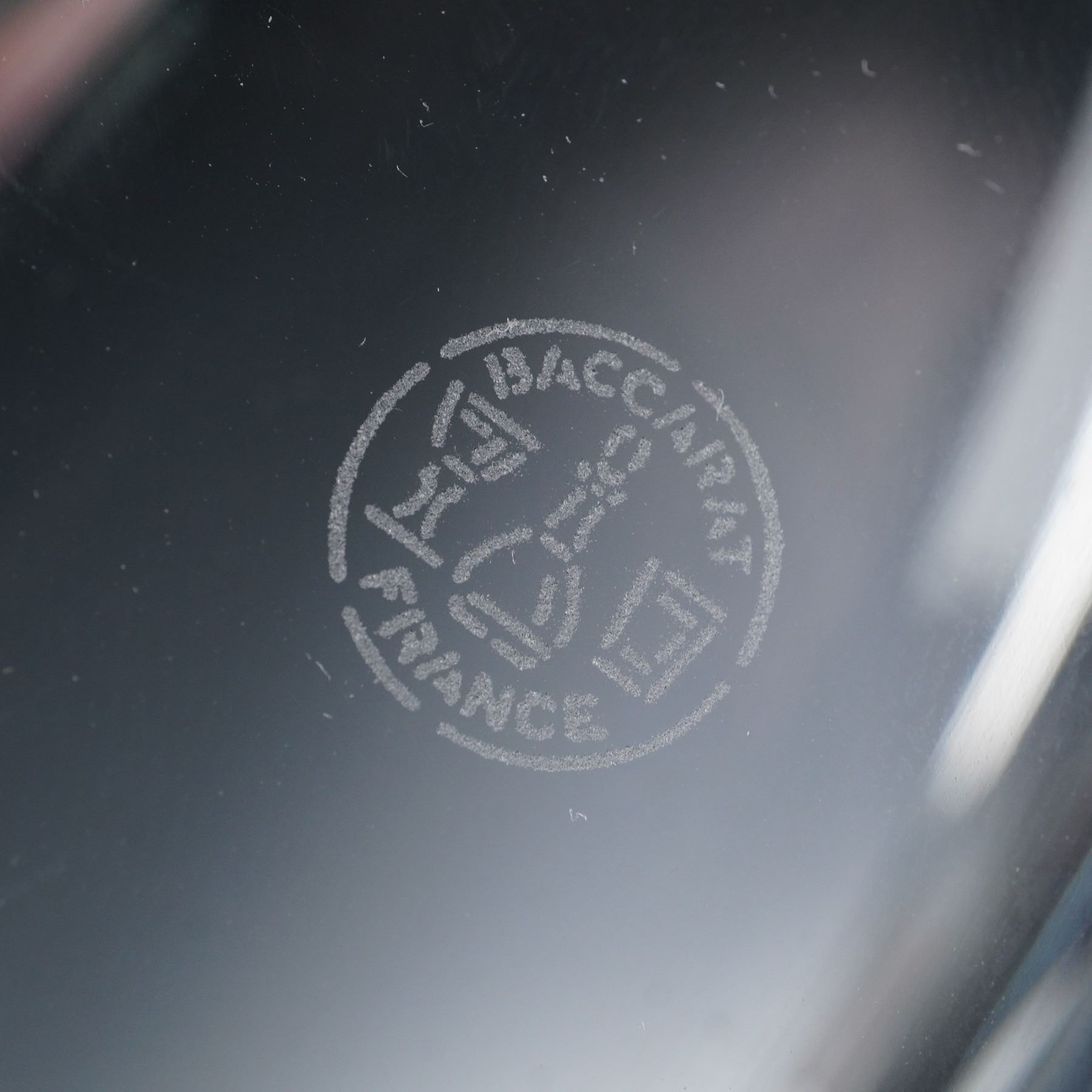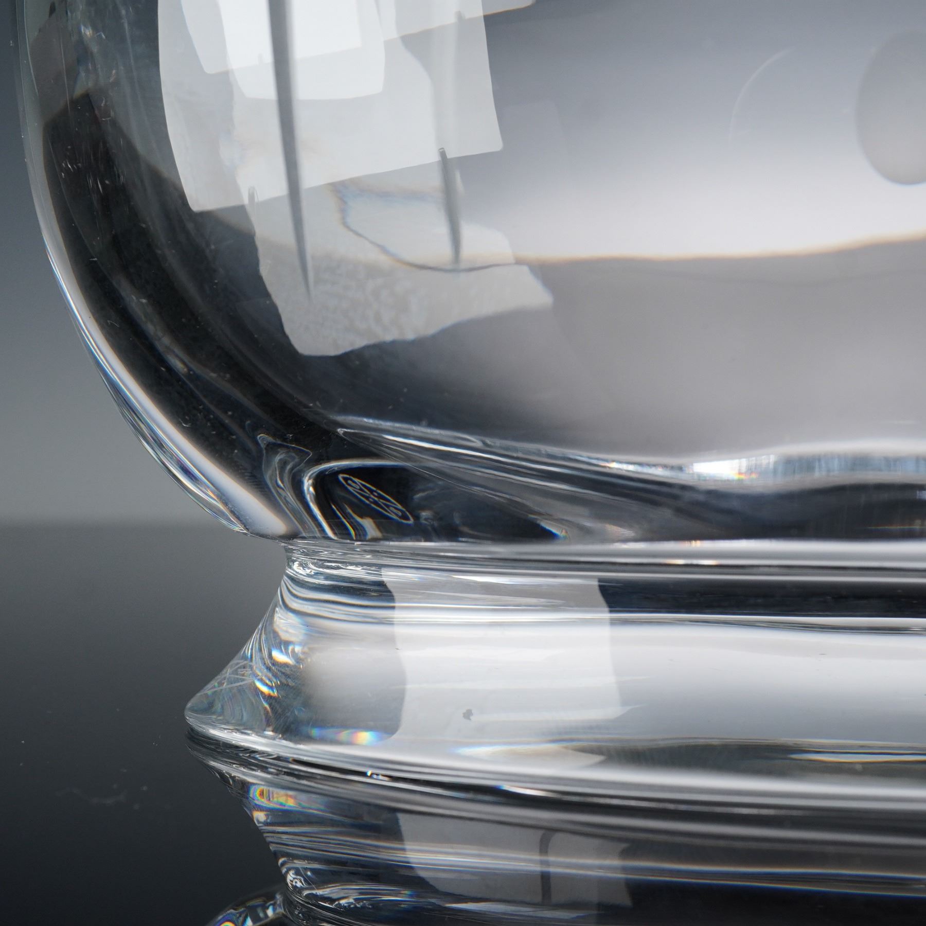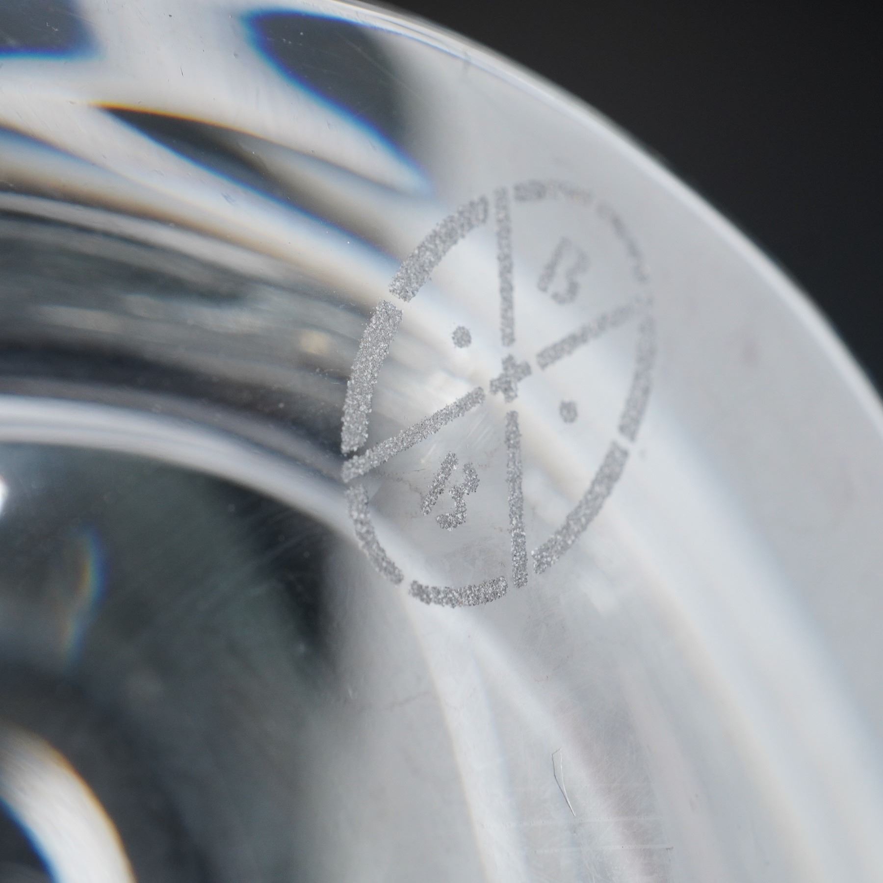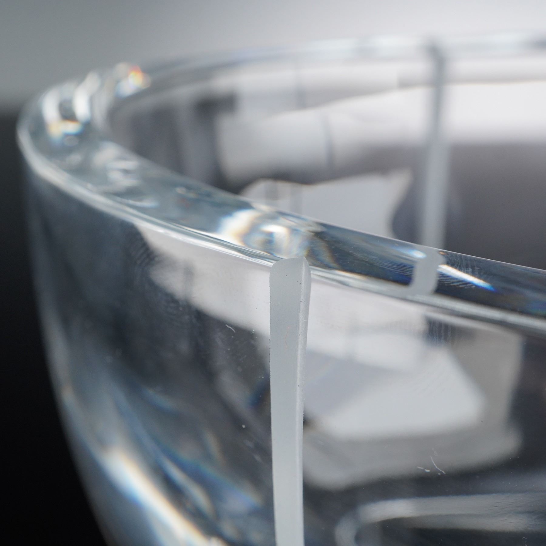 Elegant Baccarat crystal Tranquility bowl featuring a sleek oval form with etched line and dot motif. The bowl is crafted of fine clear crystal, displaying Baccarat's exceptional clarity and craftsmanship. Retains its original red Baccarat label and is etched on the base with the Baccarat France hallmark.