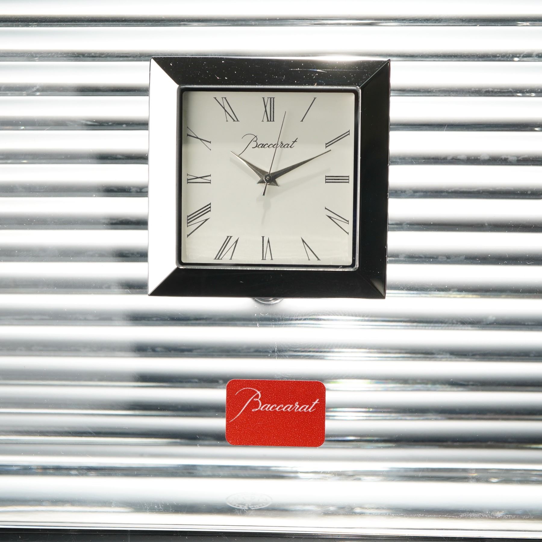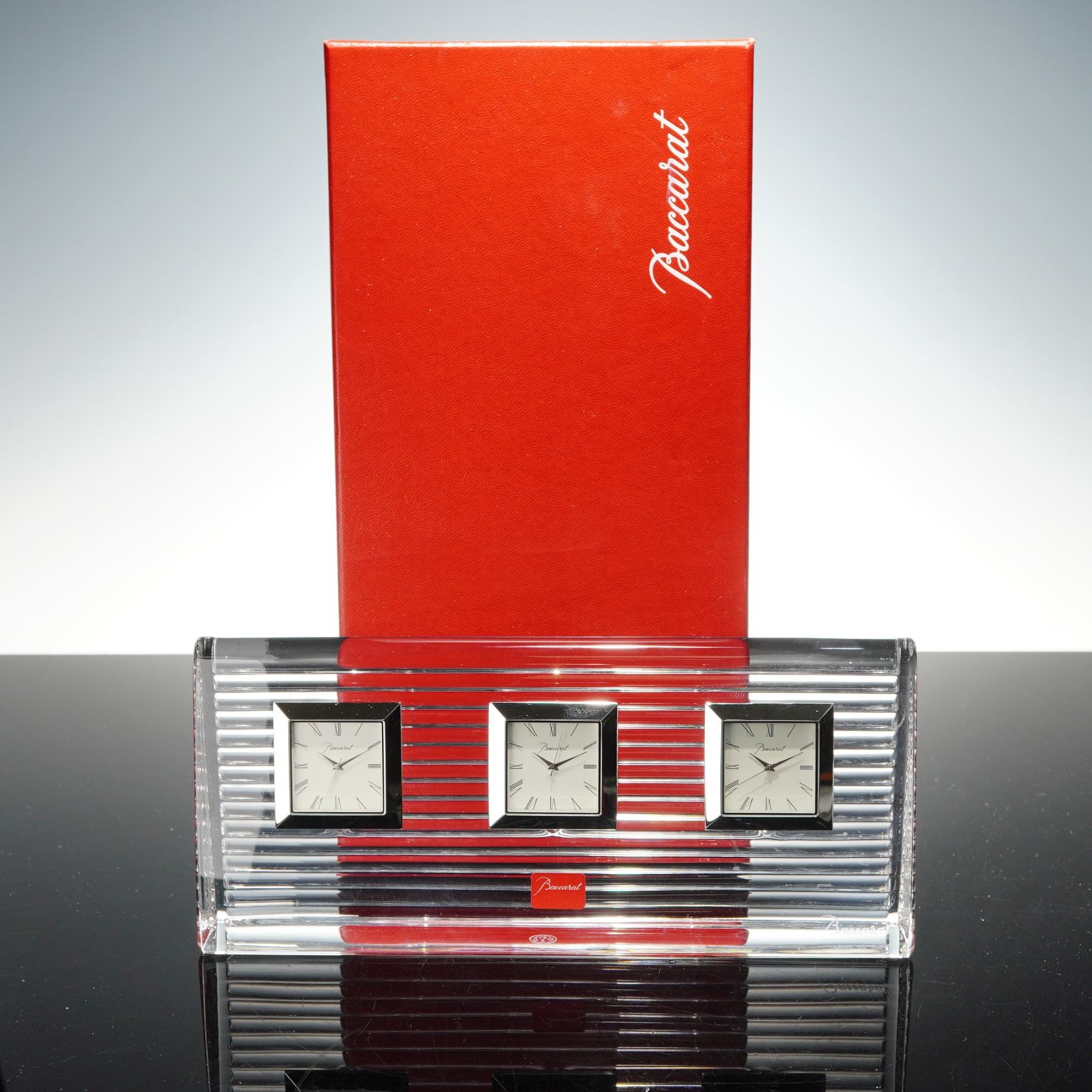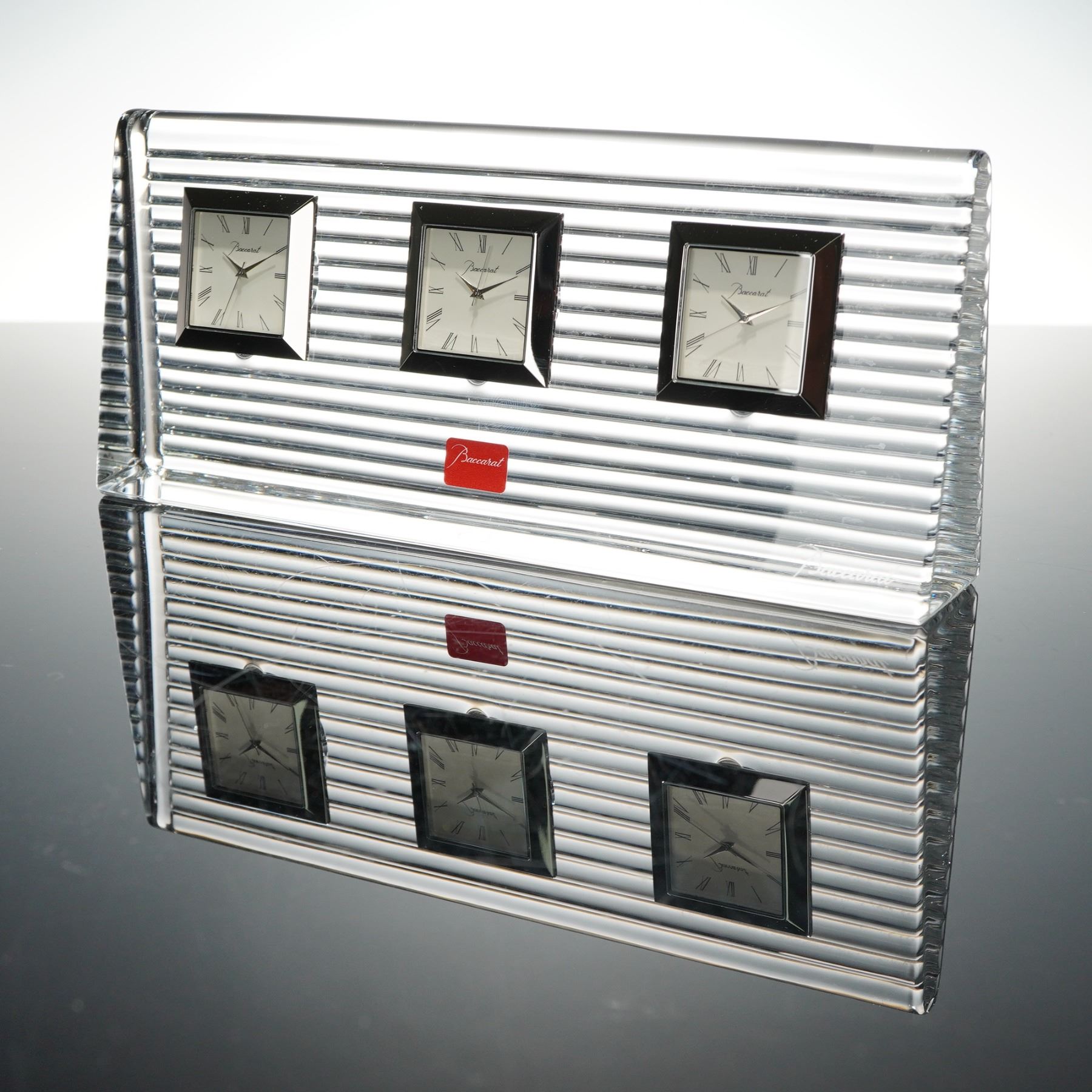 A striking Galilee crystal desk clock featuring three inset square clock faces with silver-tone frames and white dials marked with Roman numerals. The body is crafted from clear, ribbed crystal in a trapezoidal form, showcasing Baccarat's signature brilliance and precision. The red Baccarat logo is displayed on the front, with the etched Baccarat France hallmark on the underside and engraved signature on the side. This item has its original box.