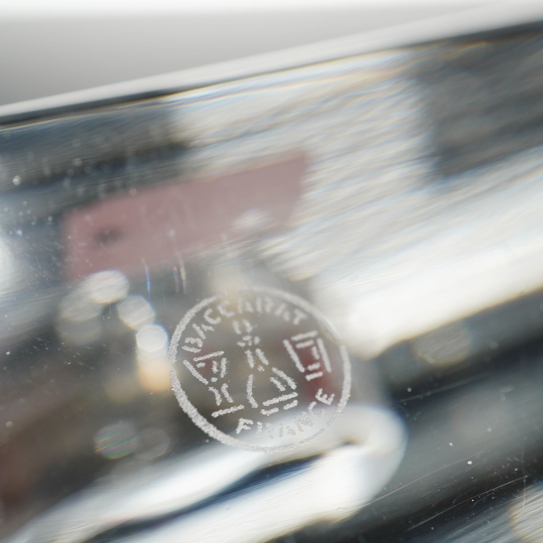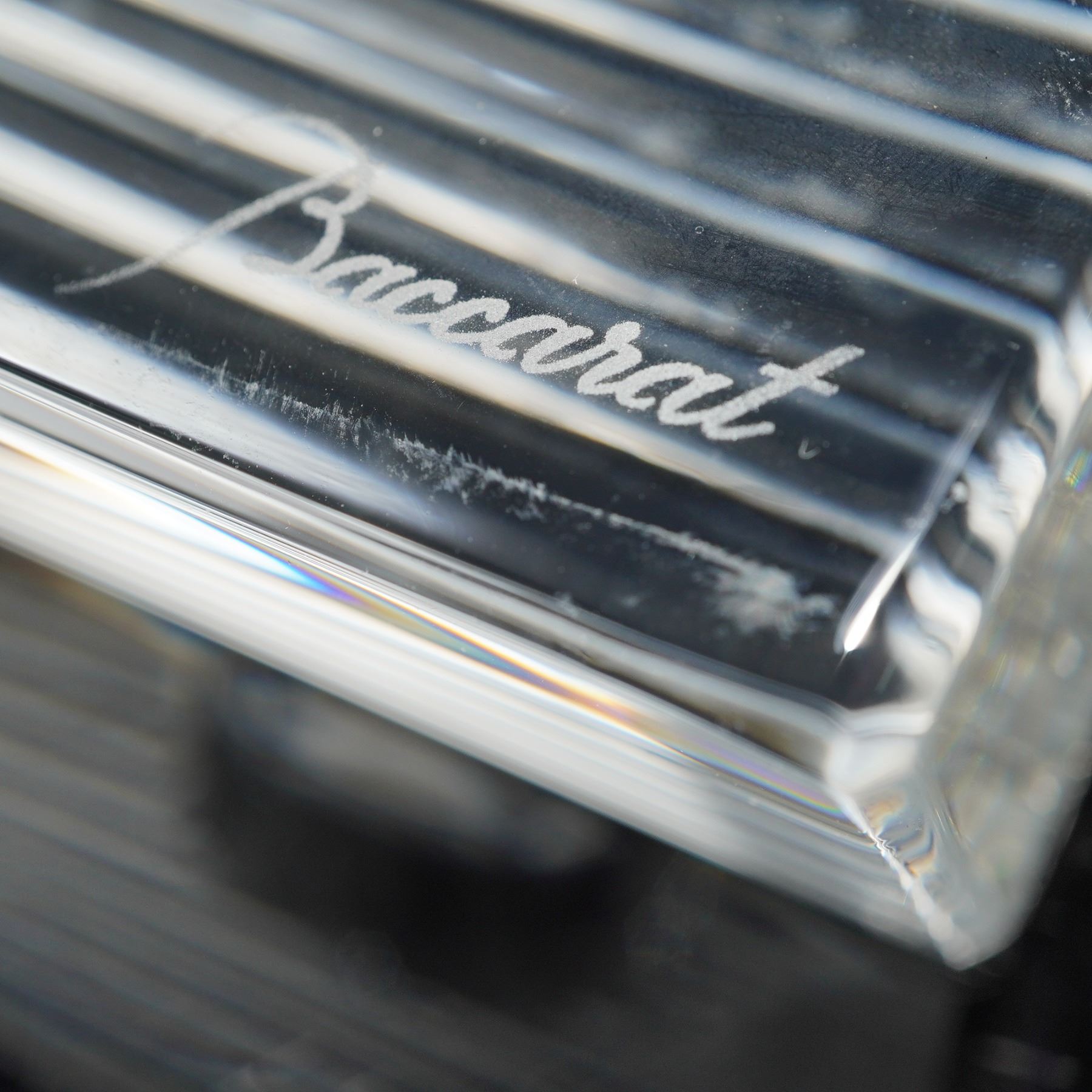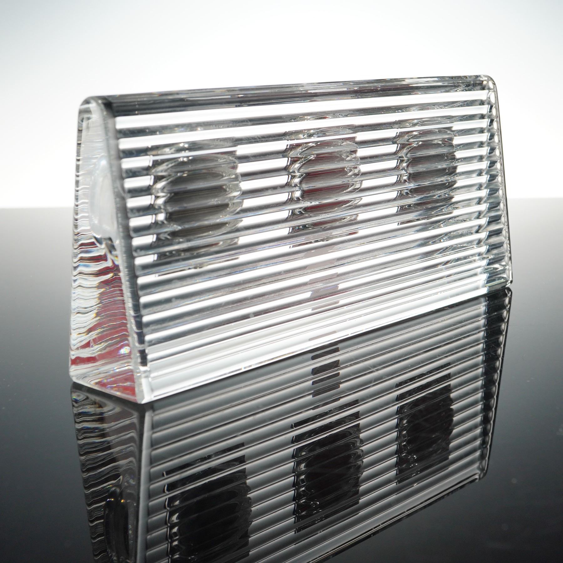 A striking Galilee crystal desk clock featuring three inset square clock faces with silver-tone frames and white dials marked with Roman numerals. The body is crafted from clear, ribbed crystal in a trapezoidal form, showcasing Baccarat's signature brilliance and precision. The red Baccarat logo is displayed on the front, with the etched Baccarat France hallmark on the underside and engraved signature on the side. This item has its original box.