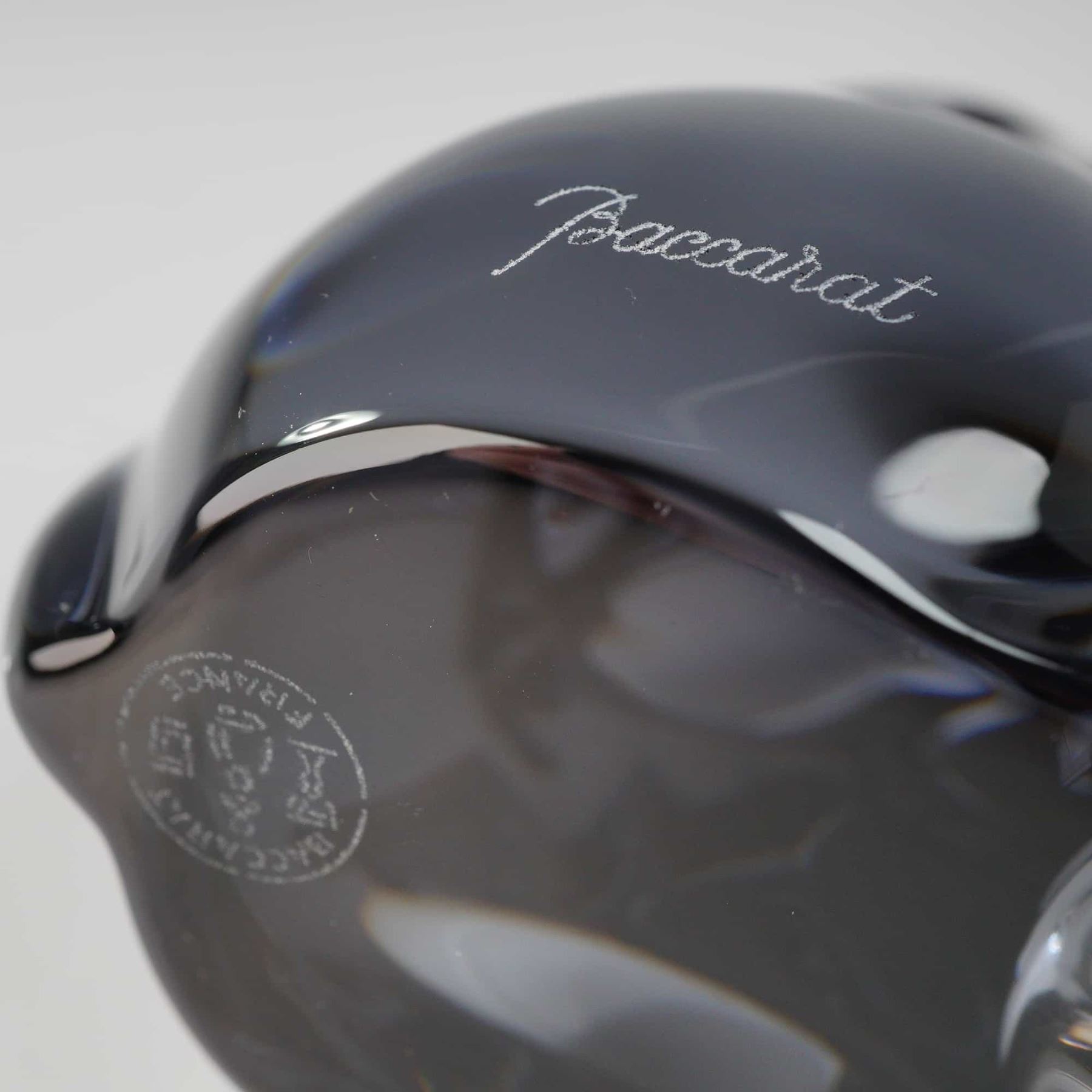 Featuring the smooth, minimalist lines characteristic of contemporary Baccarat decorative objects. The crystal is a deep smoky grey, maintaining a high level of translucency that catches light along its polished edges. The figurine is signed with an acid-etched Baccarat script on the lower side and bears the official circular acid-etched maker's mark on the underside, which includes a decanter, wine glass, and goblet surrounded by the text BACCARAT FRANCE. It also retains its original rectangular white paper label with a red border.