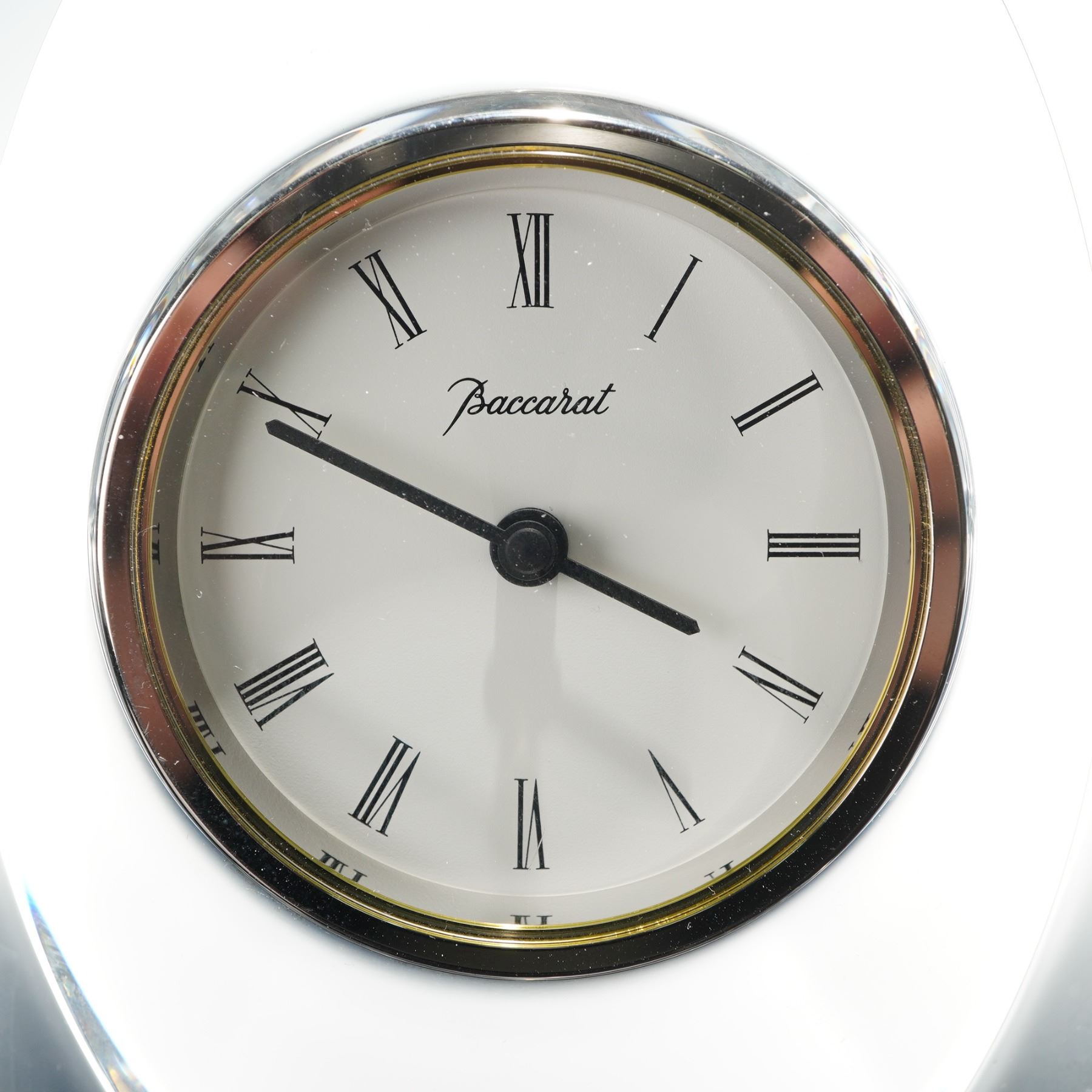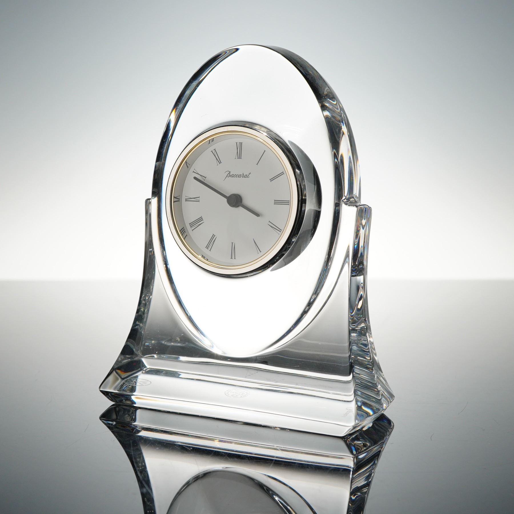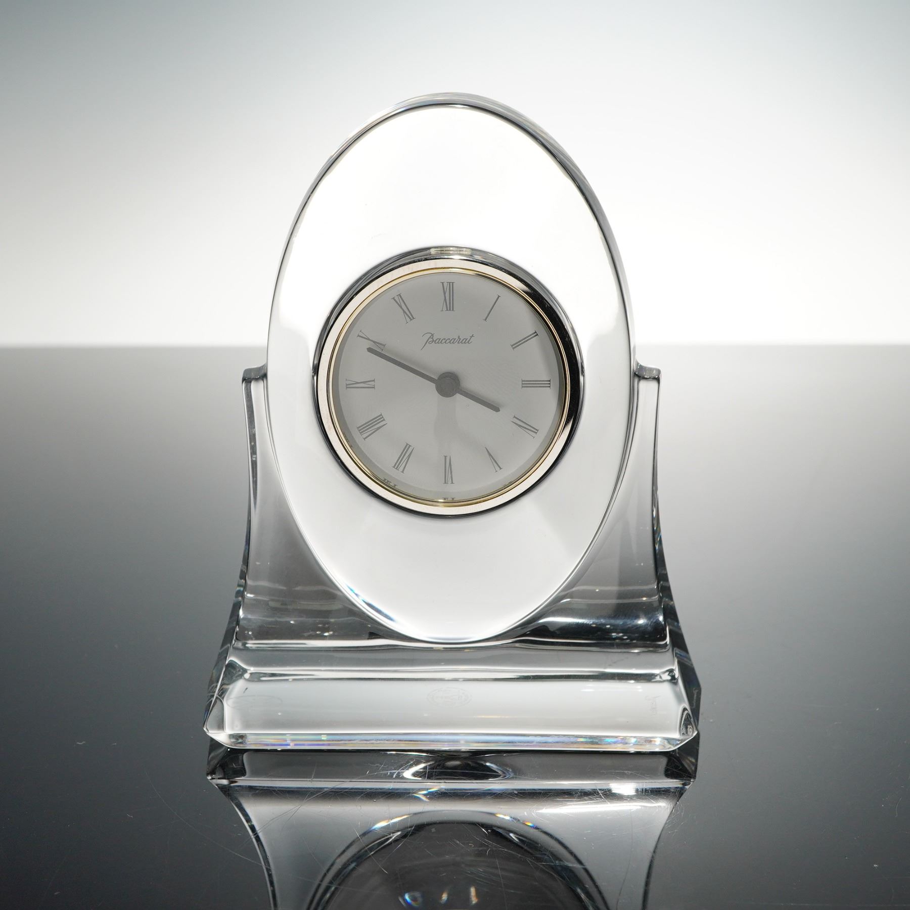 A finely crafted Baccarat crystal desk clock showcasing the brand's signature elegance and precision. The piece features a smooth, clear crystal body with an oval face set into a sturdy rectangular base, creating a refined silhouette that captures and reflects light beautifully. The circular clock insert displays Roman numerals with black hands against a white dial, framed by a metallic bezel that enhances its understated sophistication. The piece bears the Baccarat etched signature and hallmark stamps, signifying authenticity and expert craftsmanship.