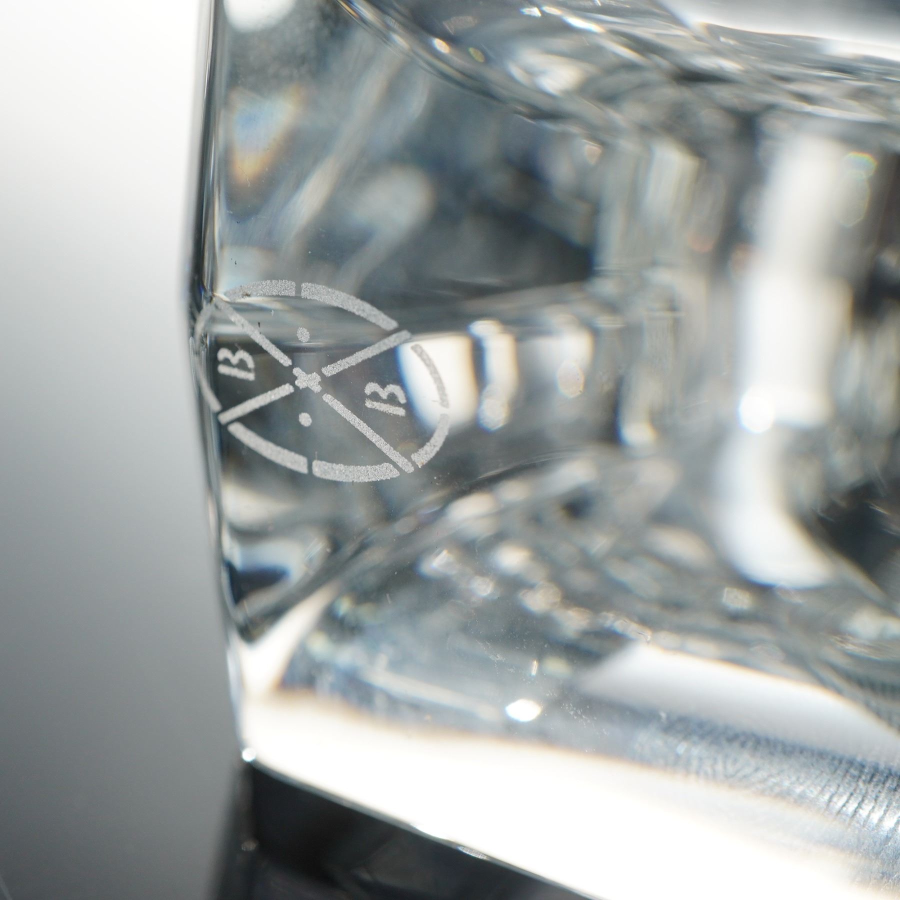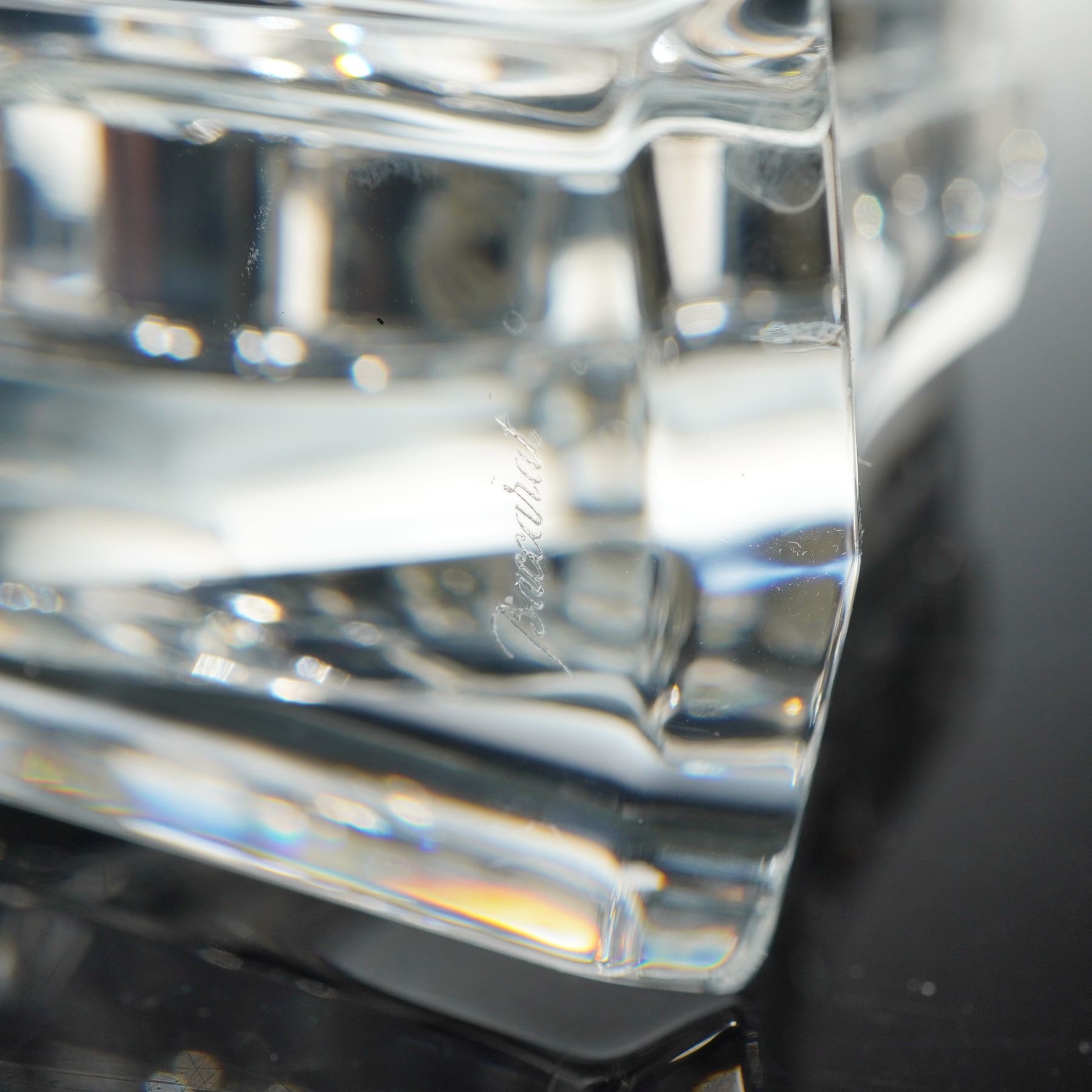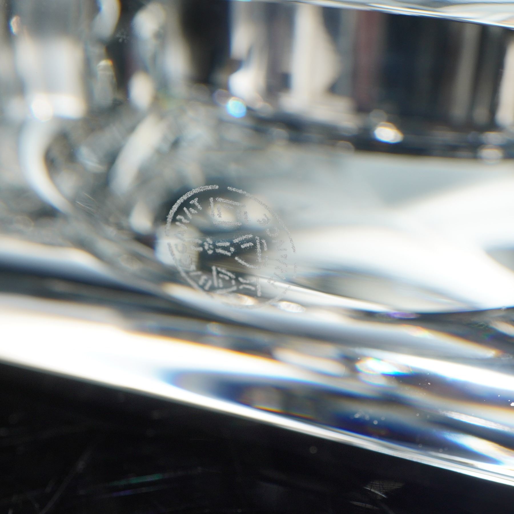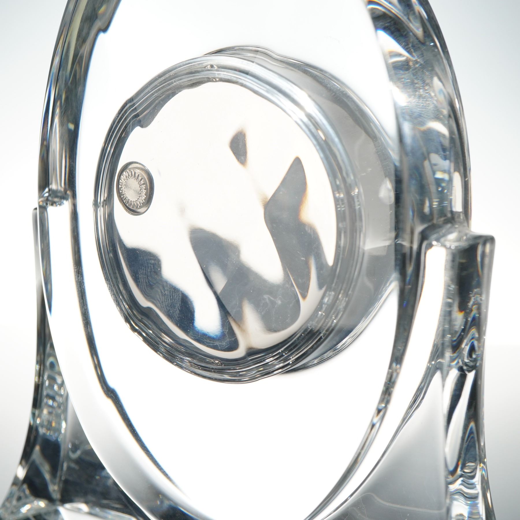 A finely crafted Baccarat crystal desk clock showcasing the brand's signature elegance and precision. The piece features a smooth, clear crystal body with an oval face set into a sturdy rectangular base, creating a refined silhouette that captures and reflects light beautifully. The circular clock insert displays Roman numerals with black hands against a white dial, framed by a metallic bezel that enhances its understated sophistication. The piece bears the Baccarat etched signature and hallmark stamps, signifying authenticity and expert craftsmanship.