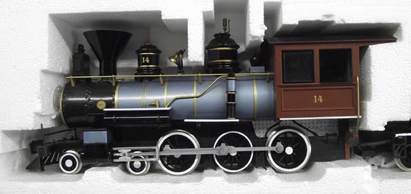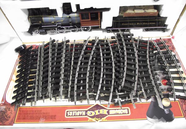 Bachman Train Set. ''G'' scale, ''Gold Rush'', includes:4-6-0 Steam locomotive w/Tender featuring: Operating headlight, electronic steam sound and realistic smoke. Lighted combine w/operating doors. Observation car w/lighted interior and drumhead. 20 running feet of revolutionary new steel alloy track. UL approved power pack. In original box. Locomotive measures approx. 7''H x 17 1/2''L. Buyers Pay Actual Shipping and Handling Charges(see terms and conditions for more information).