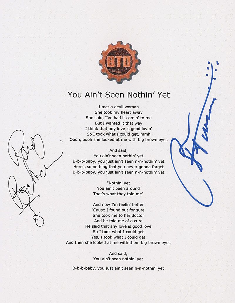 Printed souvenir lyrics to ‘You Ain’t Seen Nothin’ Yet,’ on an off-white 8.5 x 11 cardstock sheet, signed in black felt tip by Randy Bachman and blue felt tip by C. F. Turner. In very fine condition.
