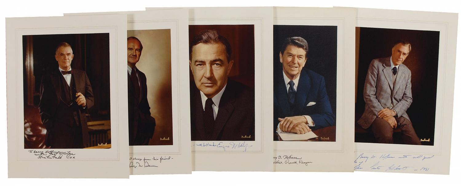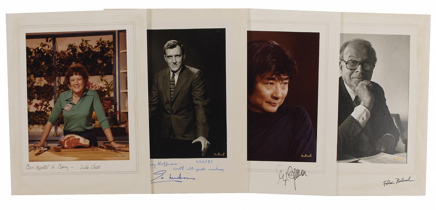 Fabian Bachrach (1917–2010) was a prominent third-generation portrait photographer known for his images of celebrities, politicians, presidents, and other key figures, but is perhaps best remembered for his portrait of then-Senator John F. Kennedy, which was later used as JFK’s official presidential portrait. Bachrach Studios, founded in Baltimore in 1868 by Bachrach, is thought to be the oldest continuously operating photography studio in the world, having photographed every chief executive from Abraham Lincoln (the only known photo taken at the Gettysburg Address). Offered are eight magnificent 7.25 x 9.25 Bachrach original portraits, each made from the original negative (all but one color), each matted and contained within its original 11 x 13.75 presentation folder, and each signed by its subject. Desirable from a photographic standpoint, the signatures were personally obtained by noted collector Barry Hoffman. Signers are: Ronald Reagan (signed beneath a calligraphic inscription), Archibald Cox (ins), Eugene McCarthy (ins), George McGovern (ins), Edmund Muskie (ins), John Kenneth Galbraith (ins), Julia Child (ins), and Seiji Ozawa. Accompanied by a portrait signed by Bachrach, and a TLS (1981) from Cox. In overall fine condition with light scattered toning to a few of the mats. A remarkable ensemble desirable to collectors of fine photography as well as autographs.