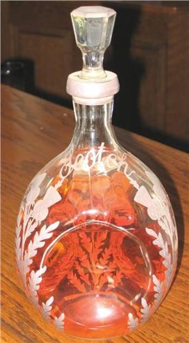 Beautiful antique Back Bar Bottle. Scotch pinch side bottle w/ heavy sterling overlay floral motif w/ SCOTCH in silver script. Sterling collar and cap atop original ground stopper. Aprox 10". 3lbs. (5-161)