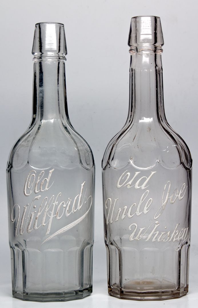 This is a lot of two clear glass un-ground single collared applied top whiskey bottles. Each stand about 11" tall and have beautiful embossed lettering. One reads "OLD UNCLE JOE WHISKEY" the other, "OLD WILLFORD". There is no cracking or chipping of either bottle. Both are in very nice condition.