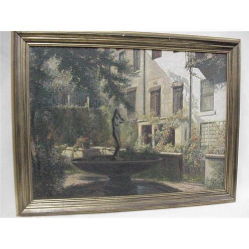 Oil painting on canvas 30" by 22", frame is 34-1/2" by 26-1/2". Garden landscape signed "L Saphier" lower right. Titled on back "Back Bay Gardens Boston Mass Painted by Louis Saphier July 1933"