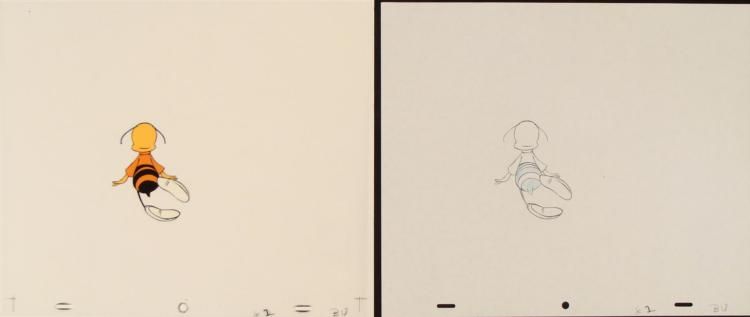 Here, it appears that Buzz is turned around. This is an original animation cel & drawing from the production of the Cheerios cereal commercial.Medium: Hand painted acetate cel with drawingCel size: 10 1/2 x 12 1/2 inchesDrawing size: 10 1/2 x 12 1/2 inchesDetails: Number and peg holes at the bottom edgeCondition: Very goodPencil color: non-photo blue and black
