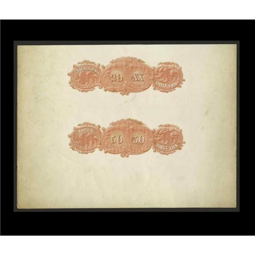 <B>Back Mockups for Proposed Notes.</B></I> These $20 and $50 back mockups were prepared for the above lot. Care went into creating this design, too. Counters were glued inside parts of this mockup that had already been affixed to the card stock. Aging is also found on this item, plus a corner bump.