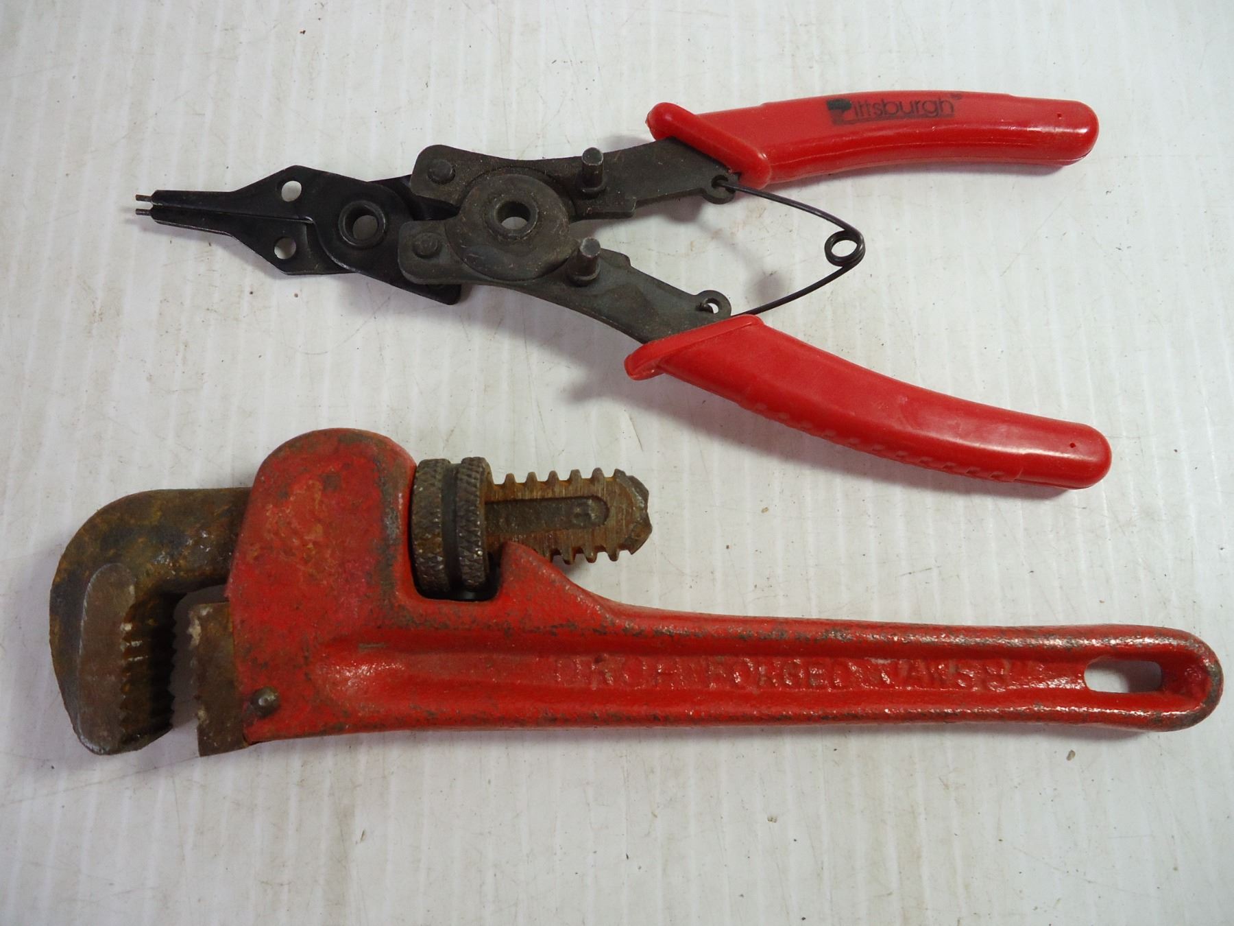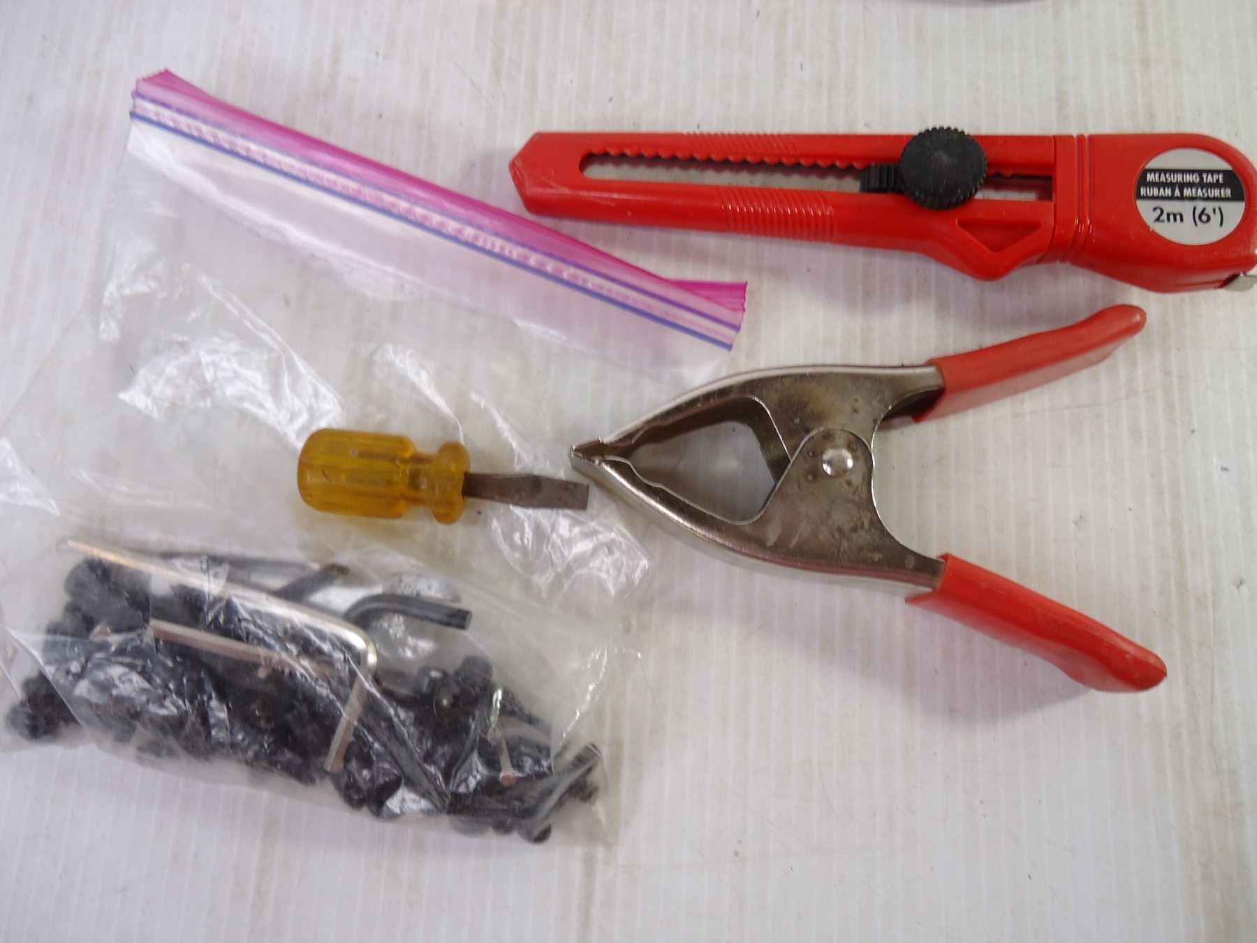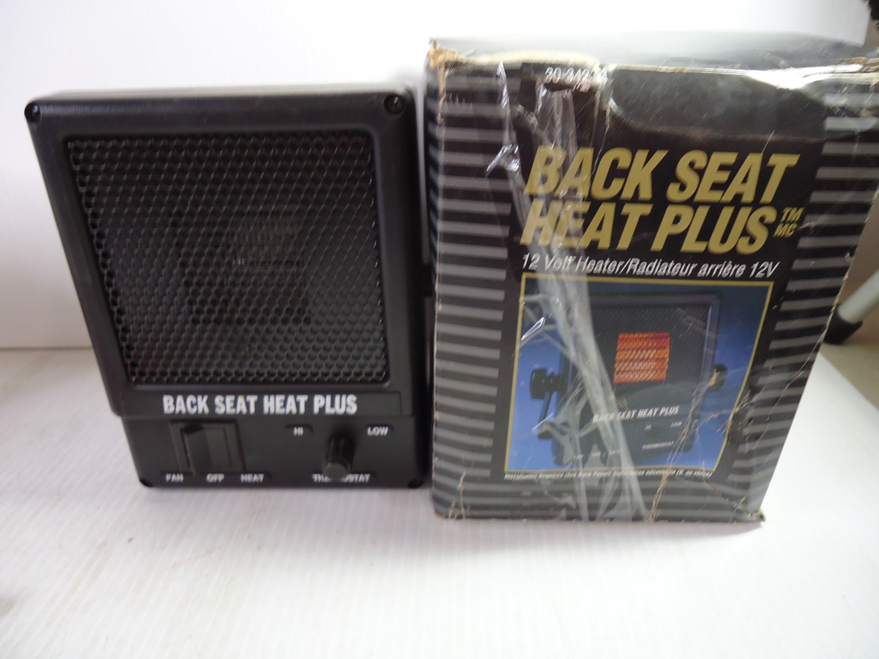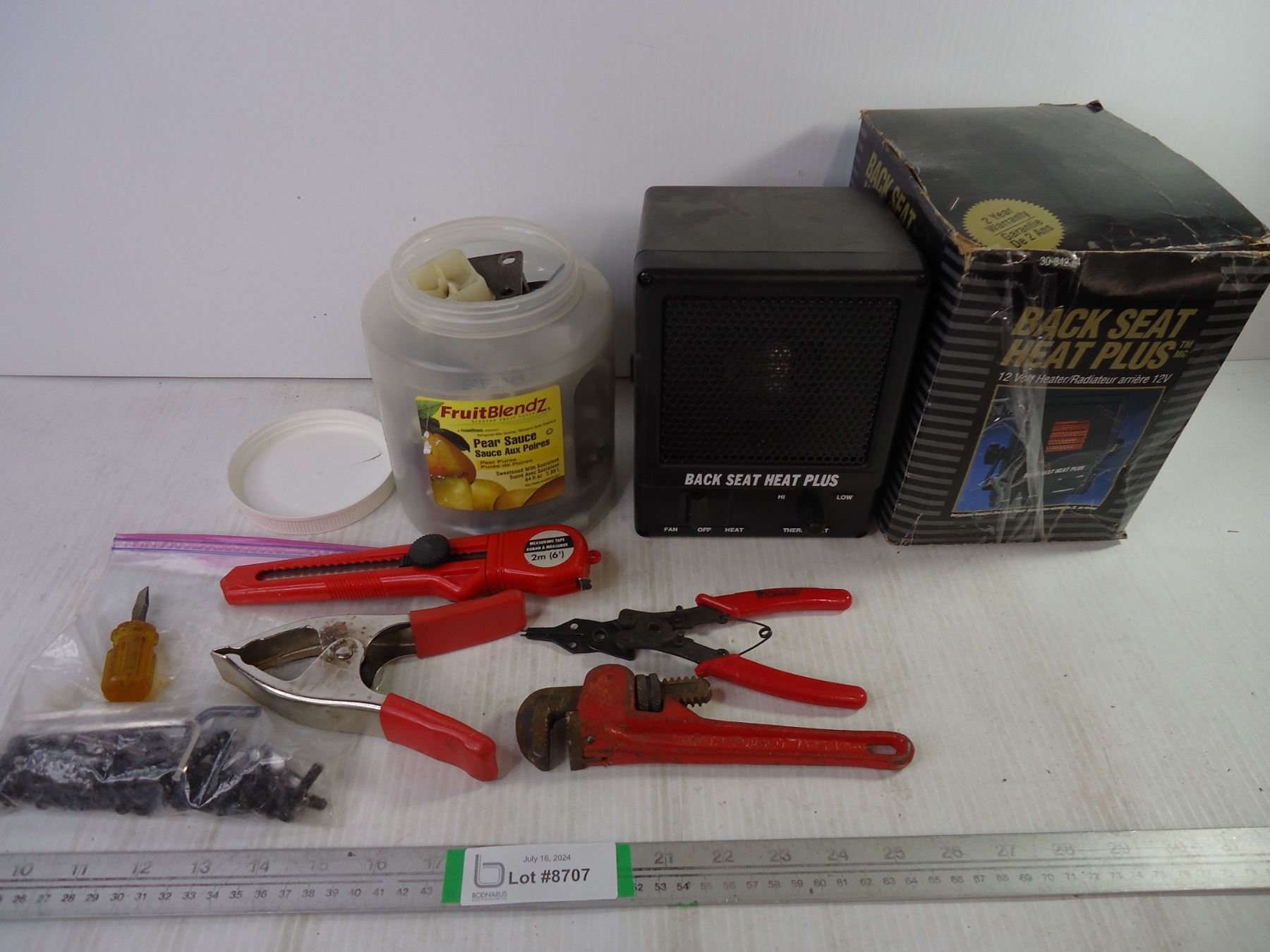 Back Seat Heater 12V(untested),Container of Hardware, Small Pipe Wrench and Misc. tools and hardware