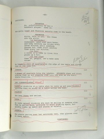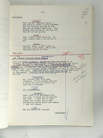 "Back To School" (1986) was one of the classic comedy's from the crazy mind of Rodney Dangerfield who both starred and co-wrote the original story. This is script supervisor Esther Vivante's actual, original production shooting script that she used on the set. It is complete with all her on-set notes, continuity, blocking, dialogue changes, and edits. An extremely rare glimpse into the making of this classic comedy. Known as "the book", all script supervisor's original noted scripts are usually turned into the editor at the end of production, so this is a rare item. Also included is a Letter of Provenance from a family member.