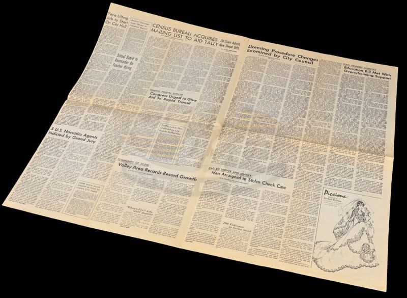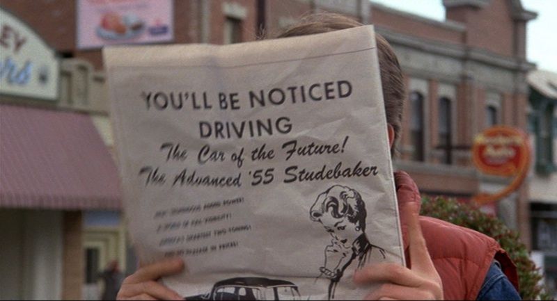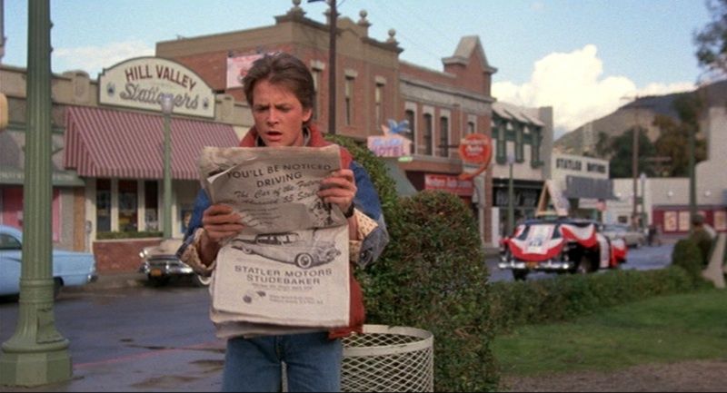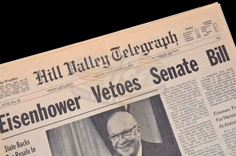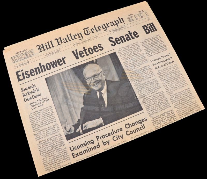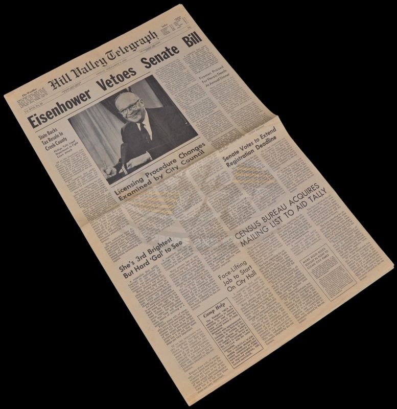 (Universal Studios, 1985) This newspaper was custom printed by the production for use by Michael J. Fox as Marty McFly. The newspaper is the style that Marty pulls out of the trash and reads the date "November 5, 1955". However this paper was printed with the date "November 4, 1955" and may have been the paper that is used on set and another with the correct date was used for the close-up insert shot showing the date on screen. Every other detail is the same as seen on screen including the "Statler Motors" ad on the back page. This is a very rare prop from the now classic first film in the series.