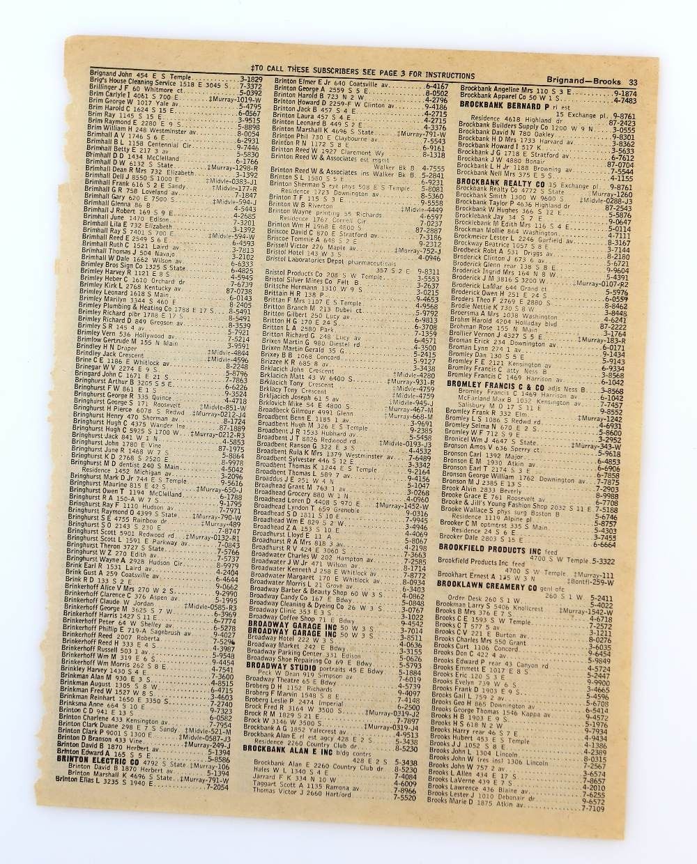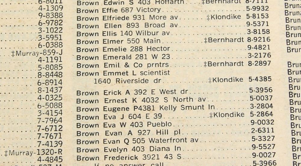 Back To The Future (1985) A torn phone book page featuring Dr. Brown's (Christopher Lloyd) contact information. This piece was made by the production for the scene in which Marty McFly (Michael J. Fox) ripped a page from a telephone book as he tried to track down Dr. Brown in 1955. This double-sided phone book page is numbered pages 33-34 and features Dr. Brown's contact information as 'Brown Emmet L scientist - 1640 Riverside Dr.' This prop has been printed on brown paper that shows a tear across one side from being removed from the phone book, 8.5 x 11 inches.Provenance: Purchased from Profiles In History at Auction 47, with original Auction Tag..