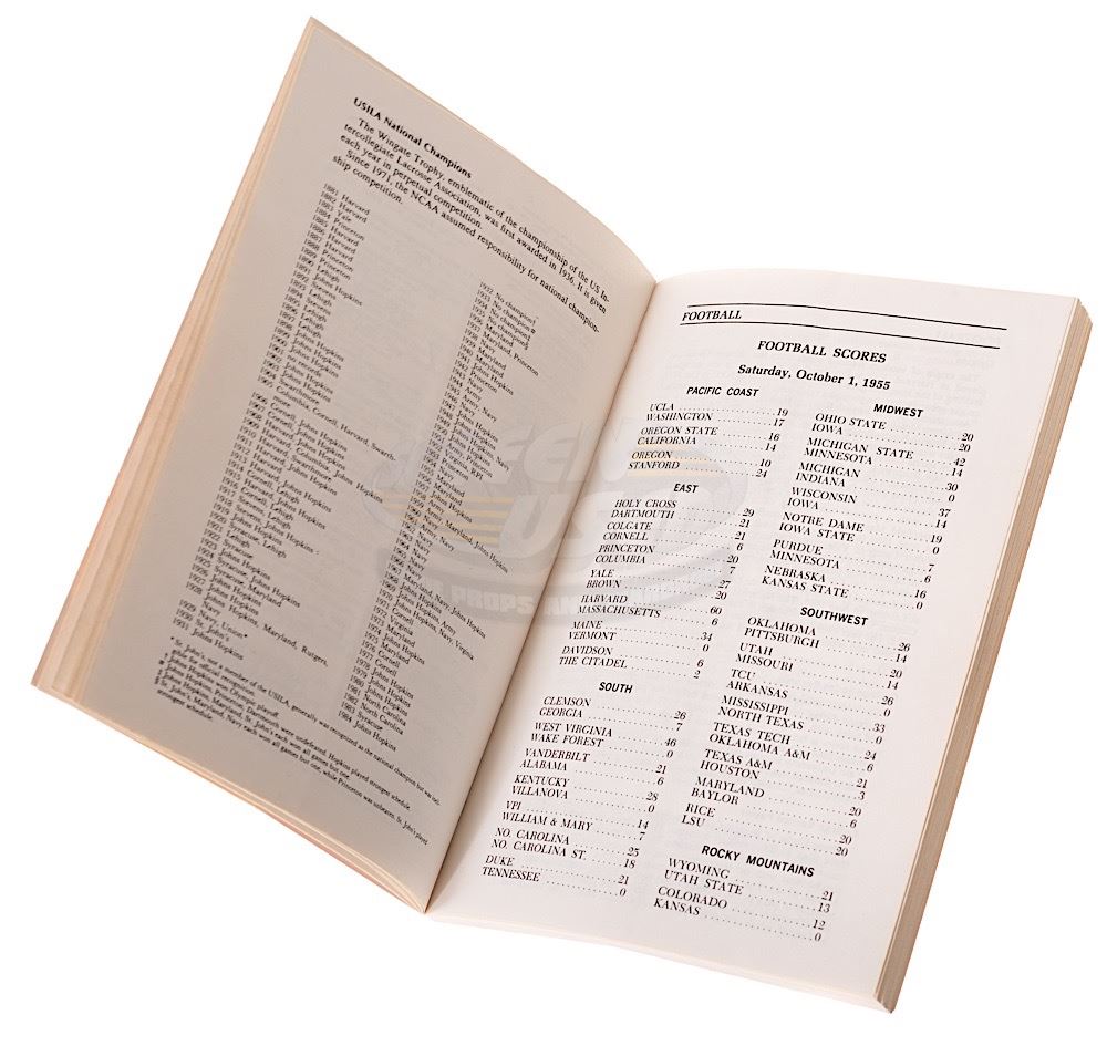 (Universal, 1989) This Grays Sports Almanac was custom-made by the production for use by Tom Wilson as "Biff Tannen", Michael J. Fox as "Marty McFly", and Christopher Lloyd as "Doc Brown". The Sports Almanac is the single most important prop from the film and in Back to the Future Part II, becomes the prop that Marty needs to get his hands on to correct the time line. This book is one of several printed for use during filming and is one that contains the printed scores page that Old Biff reads from to convince Young Biff of the book's incredible potential. The book is distressed for filming the 1955 scenes, with wear consistent with use.