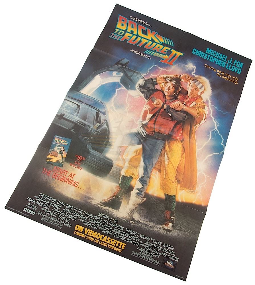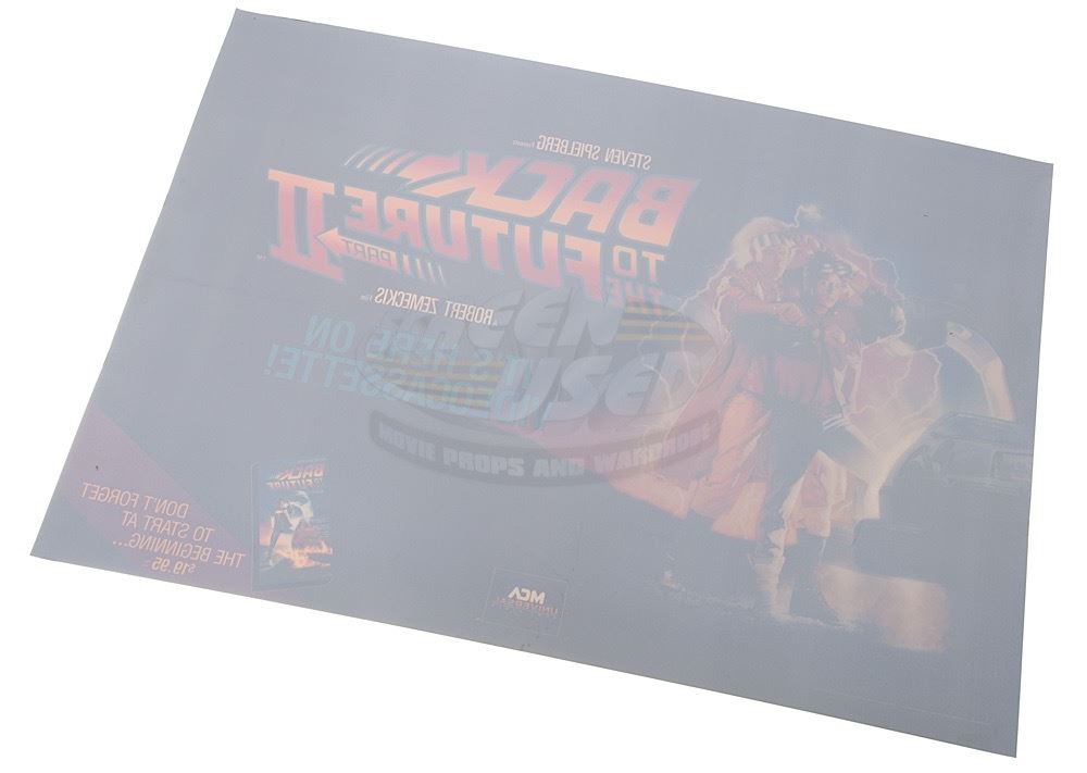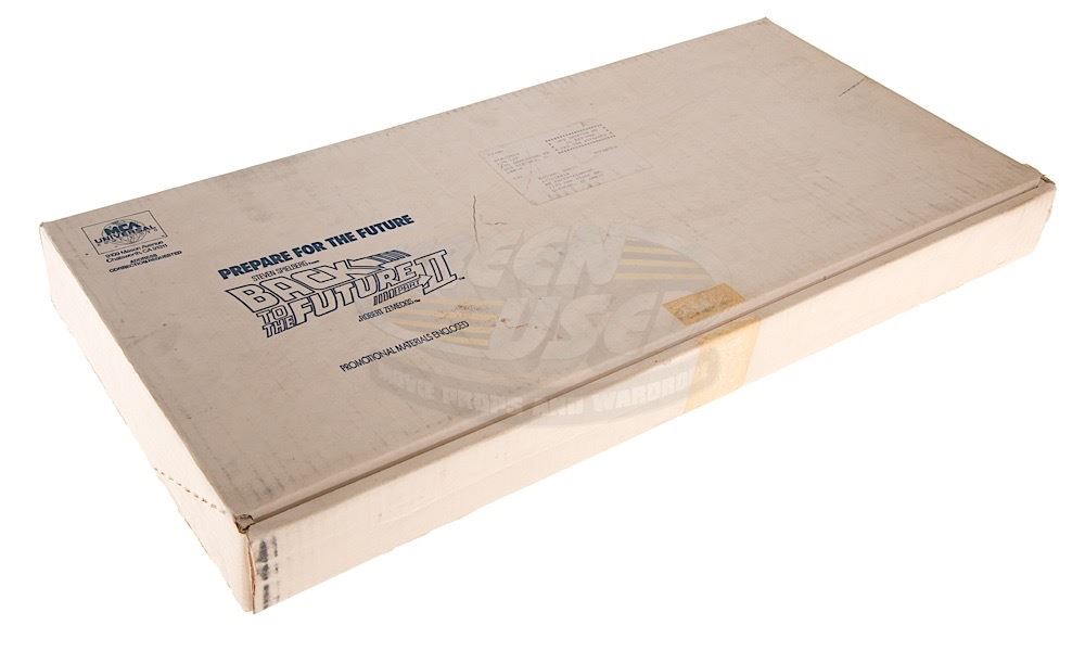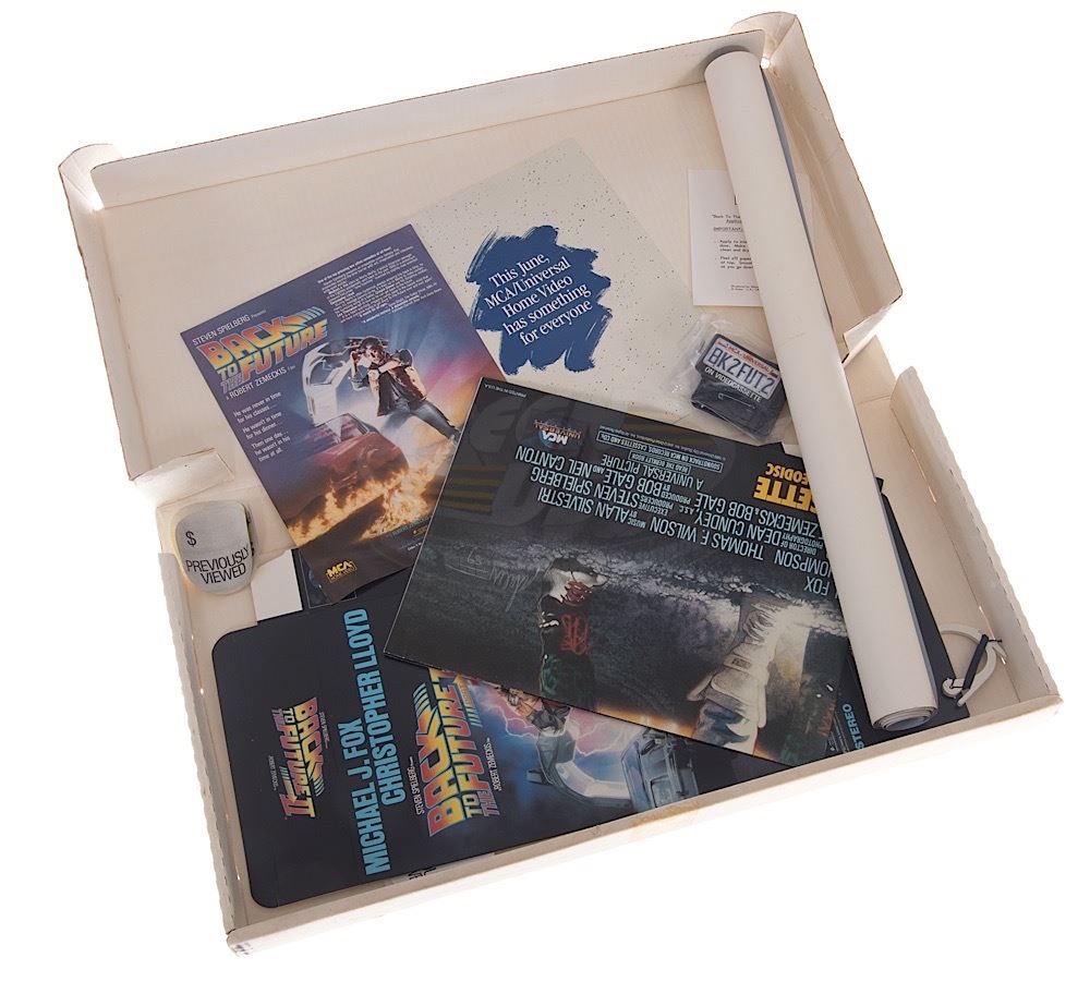 Very rare video store display promo kit sent to video store owners before the home video release of Back to the Future Part II. The kit consists of a static cling window poster (measuring 24" x 35"), five store employee buttons, an oversized video tape box (measuring 15.5" x 8.25" x 2"), a special video release one-sheet poster (measuring 39.5" x 26.75"), a newspaper ad slicks sheet, several "Previously viewed" price stickers and a June 1990 future video release fold-out from MCA/Universal. The kit is unused and is housed in its original mailing box from MCA/Universal Home Video and features the Back to the Future Part II logo. Box measures 24.5" x 12" x 2.25".