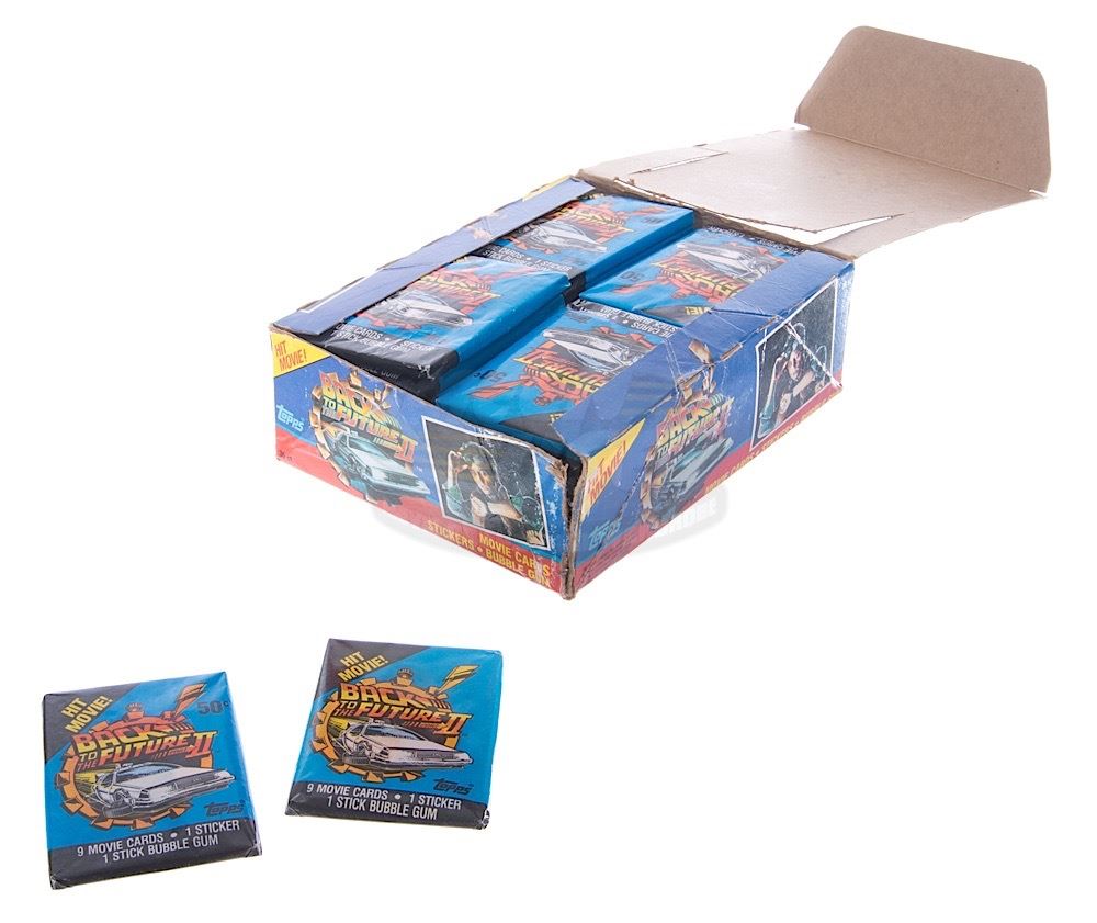 A rare Topps Back to the Future Part II retail display box filled with unopened wax packs and a complete set of trading cards and stickers. Display box has wear from use and storage. Box measures 7.5" x 5.25" x 2.5".
