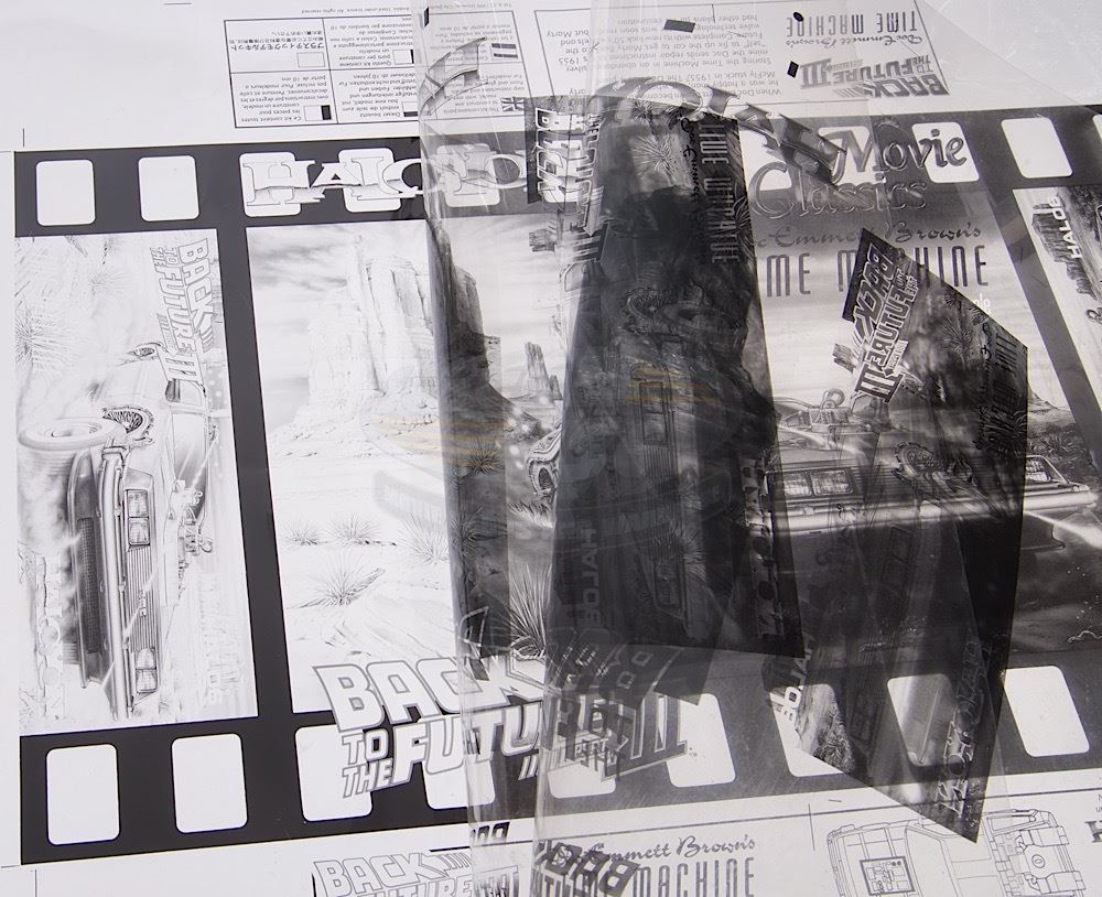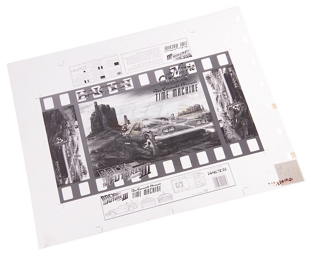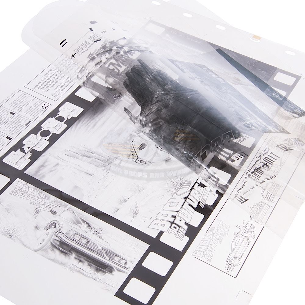 Original Halcyon 1:24 scale model DeLorean Time Machine box layout sheets. This unique piece consists of four plastic sheets, each featuring printed sections of the finished box art/layout. Each sheet measures 22.5" x 17.75". A very rare model production piece, wear from use and storage is present.